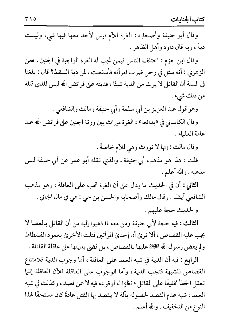 الرابع: فيه أن الدية في شبه العمد على العاقلة، أما وجوب الدية فلامتناع القصاص للشبهة فتجب الدية، وأما الوجوب على العاقلة فلأن العاقلة إنما تعقل الخطأ تخفيفًا على القاتل؛ نظرًا له لوقوعه فيه لا عن قصد، وكذلك في شبه العمد، شبه عدم القصد لحصوله بآلة لا يقصد بها القتل عادةً كان مستحقًا لهذا النوع من التخفيف. والله أعلم.