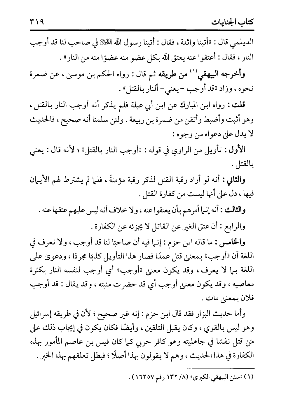 قلت: رواه ابن المبارك عن ابن أبي عبلة فلم يذكر أنه أوجب النار بالقتل، وهو أثبت وأضبط وأتقن من ضمرة بن ربيعة. ولئن سلمنا أنه صحيح، فالحديث لا يدل على دعواه من وجوه: