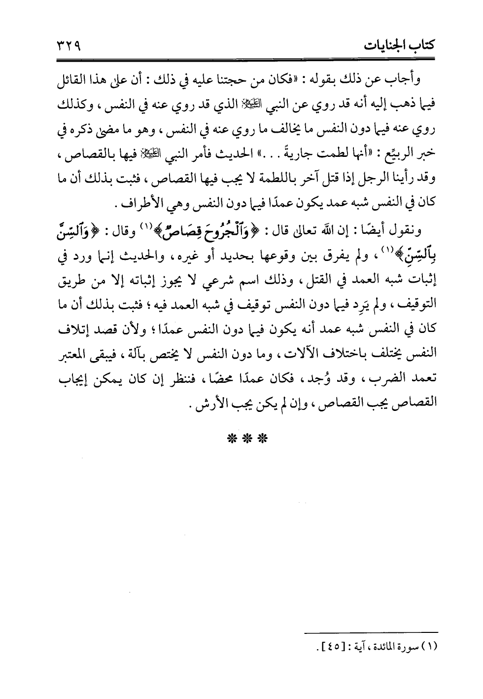 وأجاب عن ذلك بقوله: "فكان من حجتنا عليه في ذلك: أن على هذا القائل فيما ذهب إليه أنه قد روي عن النبي -عليه السلام- الذي قد روي عنه في النفس، وكذلك روي عنه فيما دون النفس ما يخالف ما روي عنه في النفس، وهو ما مضى ذكره في خبر الربيِّع: "أنها لطمت جاريةً. . . ." الحديث فأمر النبي -عليه السلام- فيها بالقصاص، وقد رأينا الرجل إذا قتل آخر باللطمة لا يجب فيها القصاص، فثبت بذلك أن ما كان في النفس شبه عمد يكون عمدًا فيما دون النفس وهي الأطراف.