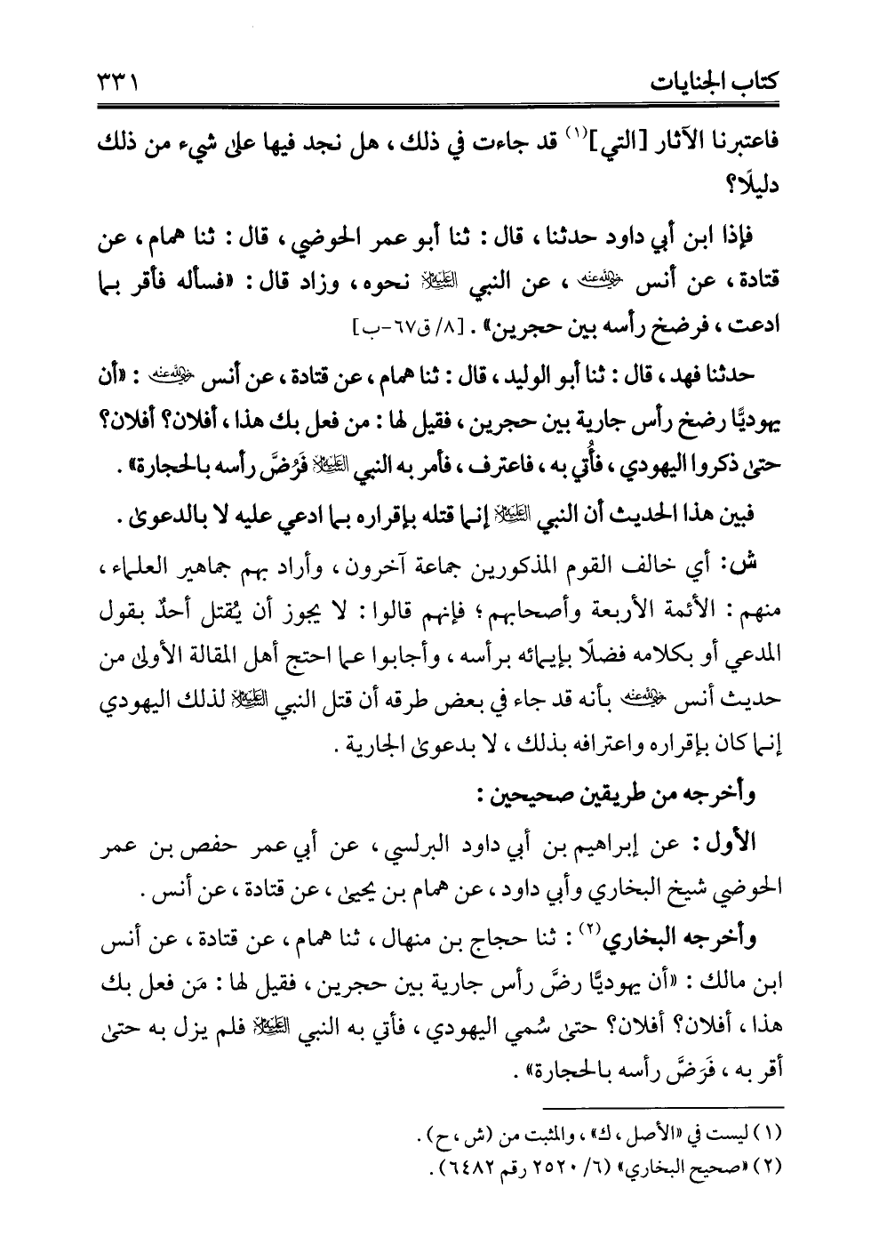 فإذا ابن أبي داود حدثنا، قال: ثنا أبو عمر الحوضي، قال: ثنا همام، عن قتادة، عن أنس - رضي الله عنه -، عن النبي -عليه السلام- نحوه، وزاد قال: "فسأله فأقر بما ادعت، فرضخ رأسه بين حجرين".