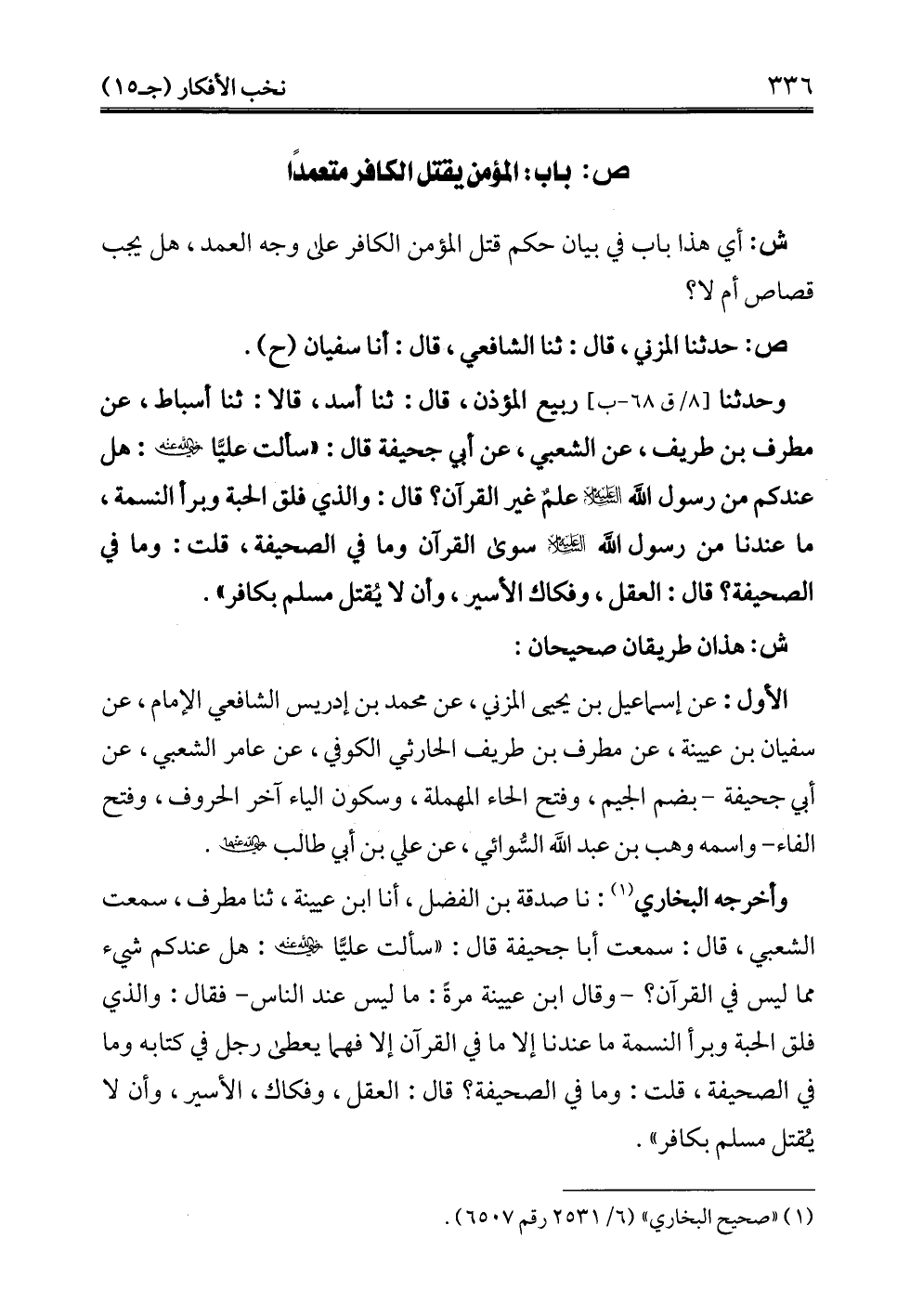 وأخرجه البخاري (¬1): نا صدقة بن الفضل، أنا ابن عيينة، ثنا مطرف، سمعت الشعبي، قال: سمعت أبا جحيفة قال: "سألت عليًّا - رضي الله عنه -: هل عندكم شيء مما ليس في القرآن؟ -وقال ابن عيينة مرةً: ما ليس عند الناس- فقال: والذي فلق الحبة وبرأ النسمة ما عندنا إلا ما في القرآن إلا فهما يعطى رجل في كتابه وما في الصحيفة، قلت: وما في الصحيفة؟ قال: العقل، وفكاك الأسير، وأن لا يُقتل مسلم بكافر".
