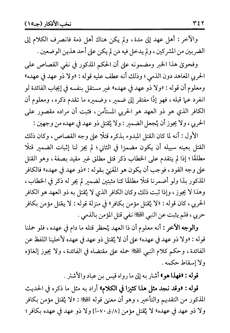 وفحوى هذا الخبر ومضمونه على أن الحكم المذكور في نفي القصاص على الحربي المعاهد دون الذمي؛ وذلك أنه عطف عليه قوله: "ولا ذو عهد في عهده" ومعلوم أن قوله: "ولا ذو عهد في عهده" غير مستقل بنفسه في إيجاب الفائدة لو انفرد عما قبله، فهو إذًا مفتقر إلى ضمير، وضميره ما تقدم ذكره، ومعلوم أن الكافر الذي هو ذو العهد هو الحربي المستأمن فثبت أن مراده مقصور على الحربي، ولا يجوز أن يُجعل الضمير: ولا يُقتل ذو عهد في عهده من وجهين: