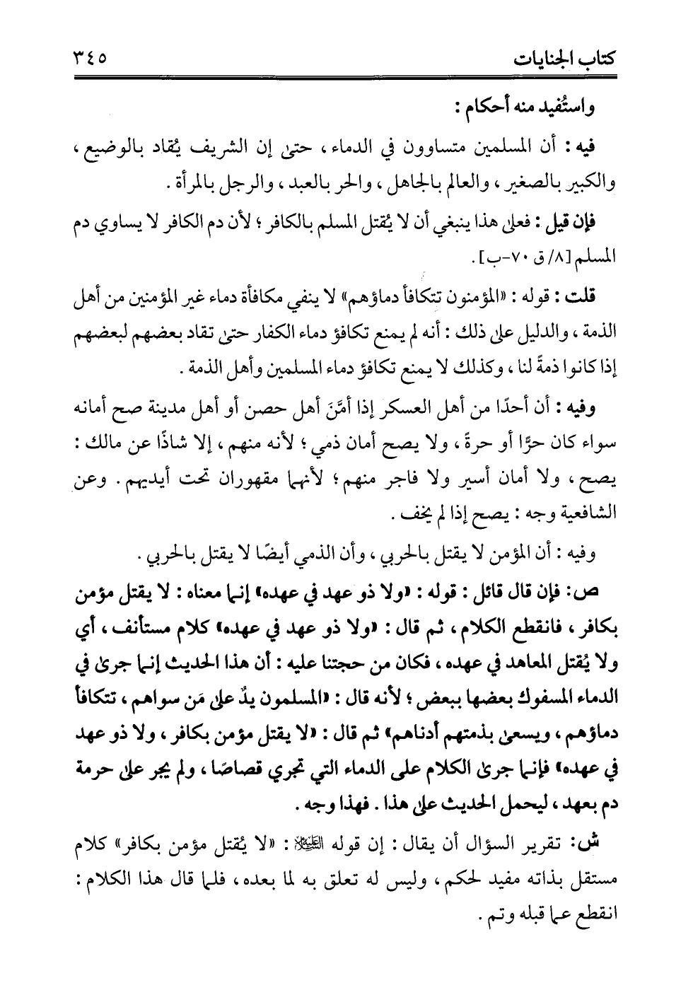 ش: تقرير السؤال أن يقال: إن قوله -عليه السلام-: "لا يُقتل مؤمن بكافر" كلام مستقل بذاته مفيد لحكم، وليس له تعلق به لما بعده، فلما قال هذا الكلام: انقطع عما قبله وتم.