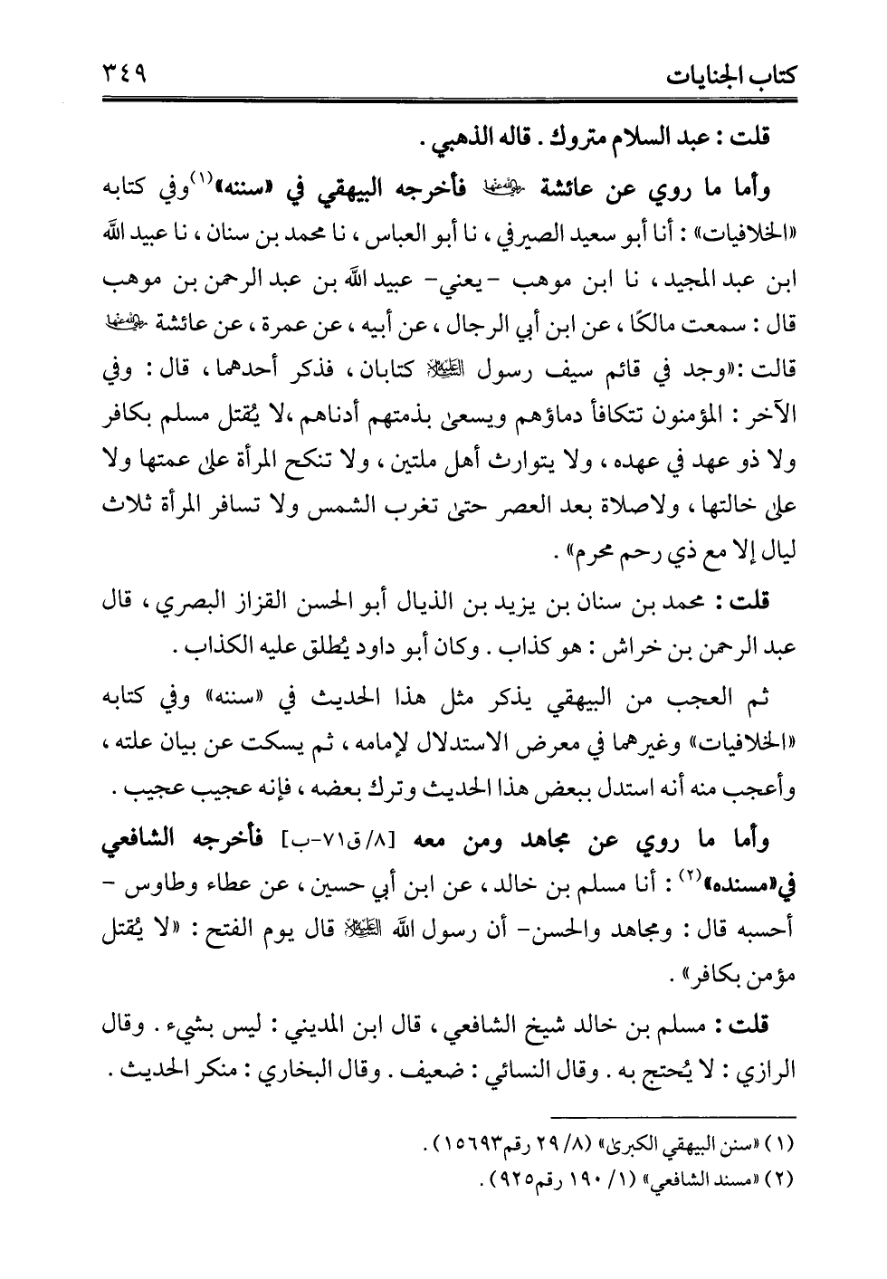 وأما ما روي عن عائشة - رضي الله عنها - فأخرجه البيهقي في "سننه" (¬1) وفي كتابه "الخلافيات": أنا أبو سعيد الصيرفي، نا أبو العباس، نا محمَّد بن سنان، نا عبيد الله ابن عبد المجيد، نا ابن موهب -يعني- عبيد الله بن عبد الرحمن بن موهب قال: سمعت مالكًا، عن ابن أبي الرجال، عن أبيه، عن عمرة، عن عائشة - رضي الله عنها - قالت: "وجد في قائم سيف رسول الله -عليه السلام- كتابان، فذكر أحدهما، قال: وفي الآخر: المؤمنون تتكافأ دماؤهم ويسعى بذمتهم أدناهم، لا يُقتل مسلم بكافر ولا ذو عهد في عهده، ولا يتوارث أهل ملتين، ولا تنكح المرأة على عمتها ولا على خالتها, ولا صلاة بعد العصر حتى تغرب الشمس ولا تسافر المرأة ثلاث ليال إلا مع ذي رحم محرم".