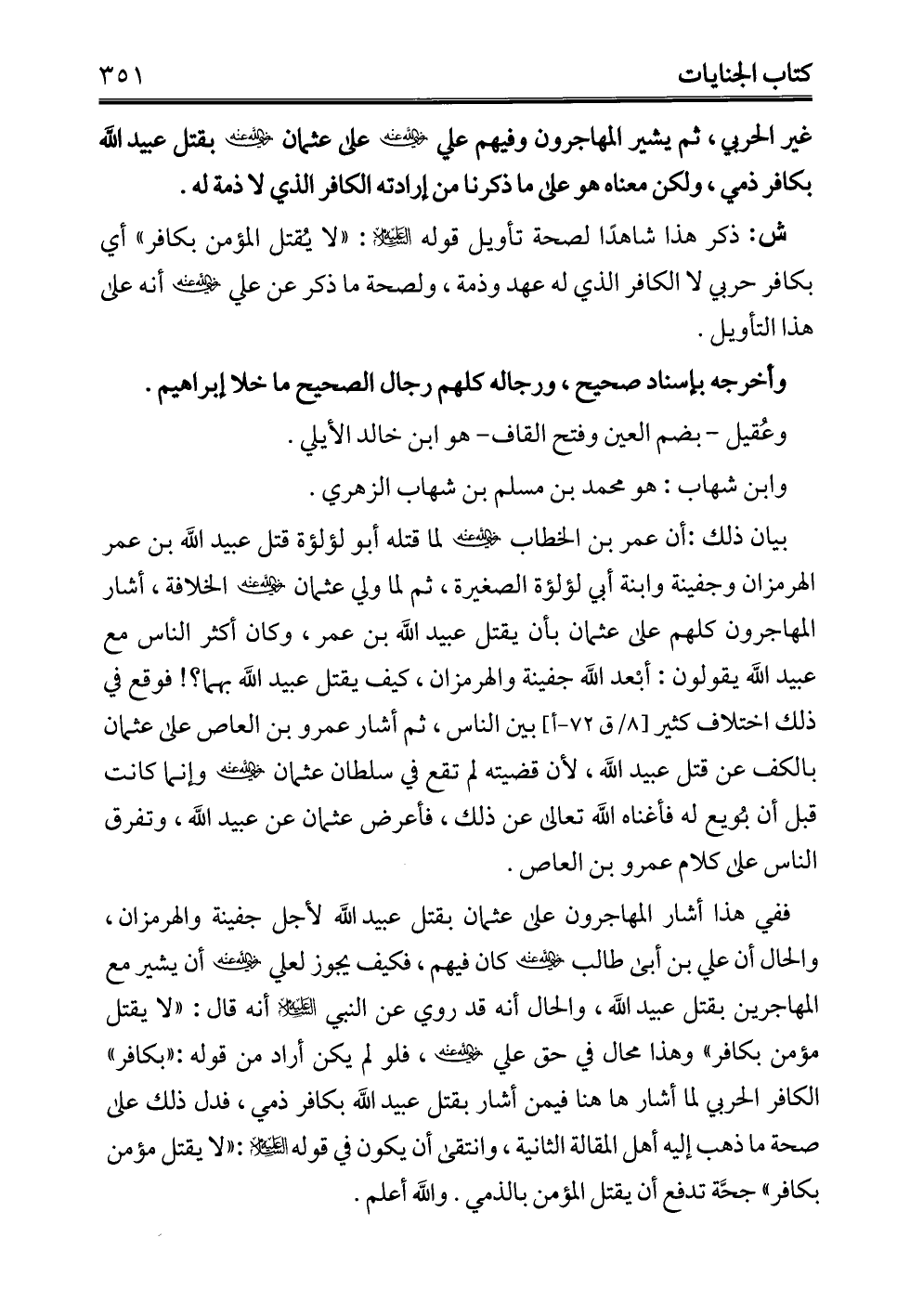 غير الحربي، ثم يشير المهاجرون وفيهم علي - رضي الله عنه - على عثمان - رضي الله عنه - بقتل عبيد الله بكافر ذمي، ولكن معناه هو على ما ذكرنا من إرادته الكافر الذي لا ذمة له.