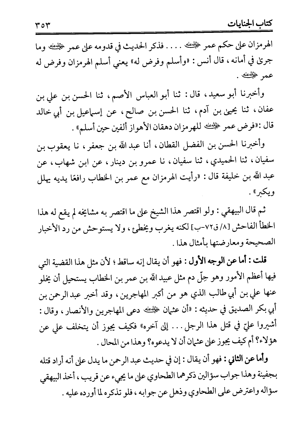 وأما عن الثاني: فهو أن يقال: إن في حديث عبد الرحمن ما يدل على أنه أراد قتله بجفينة وهذا جواب سؤالين ذكرهما الطحاوي على ما يجيء عن قريب، أخذ البيهقي سؤاله واعترض على الطحاوي وذهل عن جوابه، فلو تذكره لما أورده عليه.
