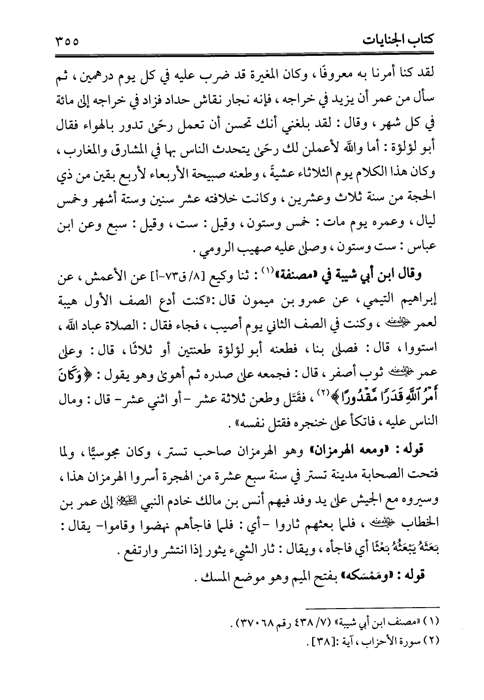 وقال ابن أبي شيبة في "مصنفة" (¬1): ثنا وكيع عن الأعمش، عن إبراهيم التيمي، عن عمرو بن ميمون قال: "كنت أدع الصف الأول هيبة لعمر - رضي الله عنه -، وكنت في الصف الثاني يوم أصيب، فجاء فقال: الصلاة عباد الله، استووا، قال: فصلى بنا، فطعنه أبو لؤلؤة طعنتين أو ثلاثًا، قال: وعلى عمر - رضي الله عنه - ثوب أصفر، قال: فجمعه على صدره ثم أهوى وهو يقول: {وَكَانَ أَمْرُ اللَّهِ قَدَرًا مَقْدُورًا} (¬2)، فقَتَل وطعن ثلاثة عشر -أو اثني عشر- قال: ومال الناس عليه، فاتكأ على خنجره فقتل نفسه".