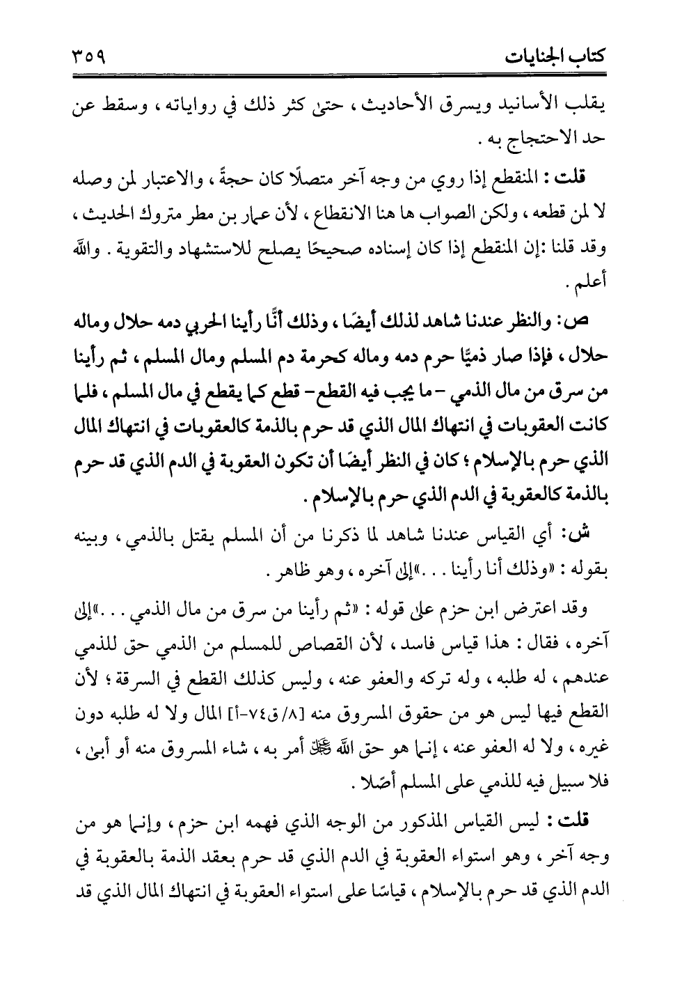 قلت: ليس القياس المذكور من الوجه الذي فهمه ابن حزم، وإنما هو من وجه آخر، وهو استواء العقوبة في الدم الذي قد حرم بعقد الذمة بالعقوبة في الدم الذي قد حرم بالإِسلام، قياسًا على استواء العقوبة في انتهاك المال الذي قد