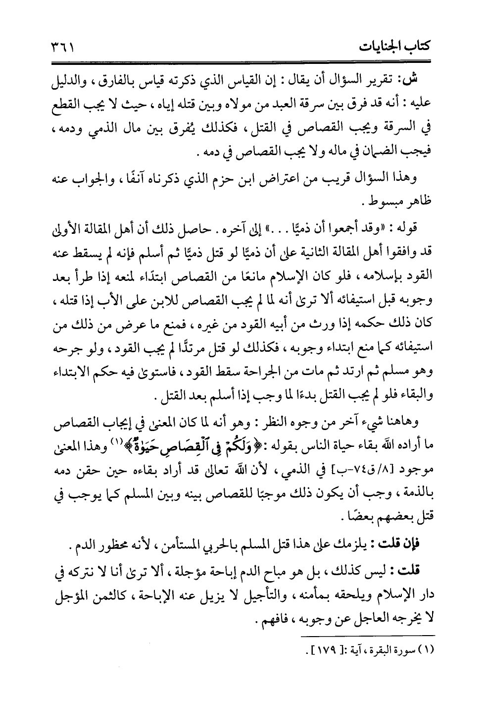 ش: تقرير السؤال أن يقال: إن القياس الذي ذكرته قياس بالفارق، والدليل عليه: أنه قد فرق بين سرقة العبد من مولاه وبين قتله إياه، حيث لا يجب القطع في السرقة ويجب القصاص في القتل، فكذلك يُفرق بين مال الذمي ودمه، فيجب الضمان في ماله ولا يجب القصاص في دمه.