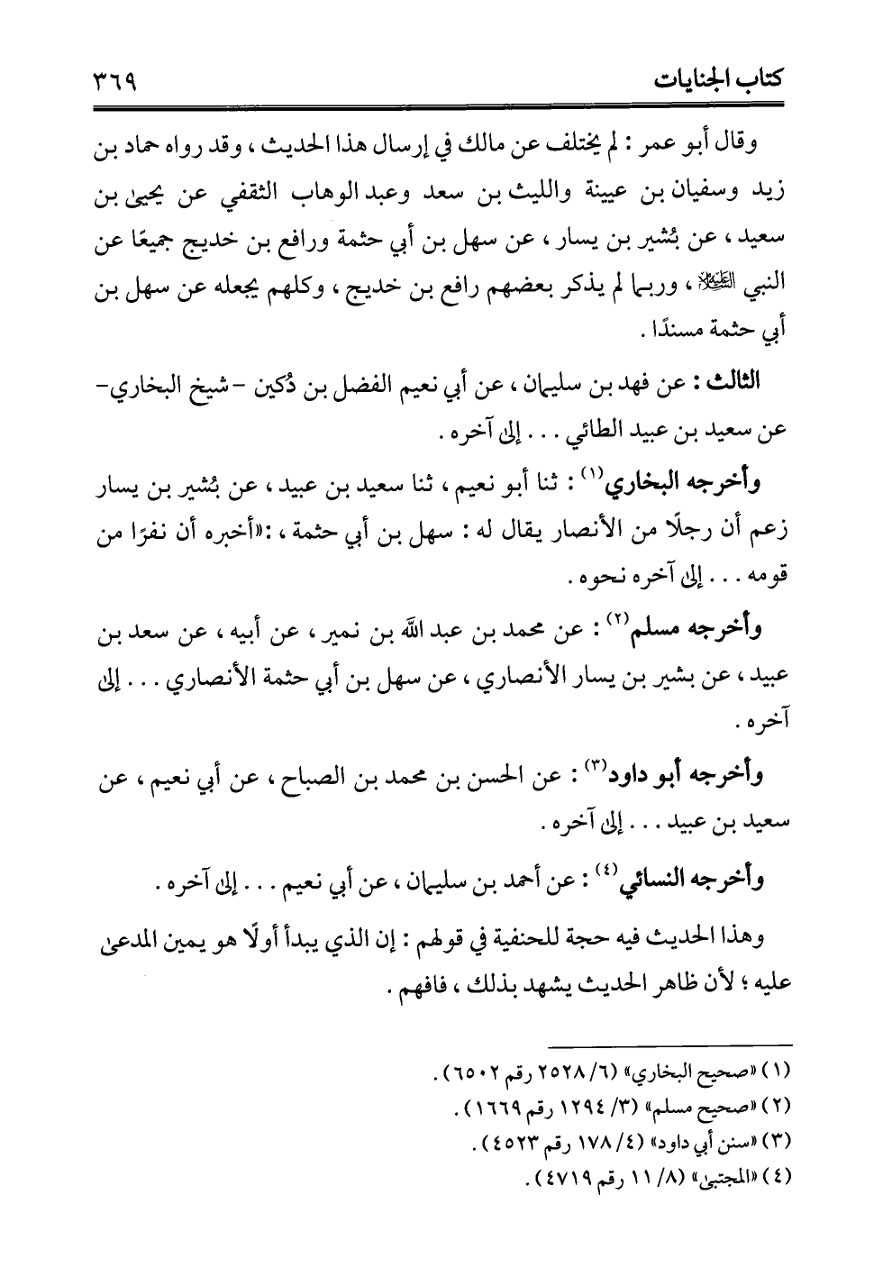 وقال أبو عمر: لم يختلف عن مالك في إرسال هذا الحديث، وقد رواه حماد بن زيد وسفيان بن عيينة والليث بن سعد وعبد الوهاب الثقفي عن يحيى بن سعيد، عن بُشير بن يسار، عن سهل بن أبي حثمة ورافع بن خديج جميعًا عن النبي -عليه السلام-، وربما لم يذكر بعضهم رافع بن خديج، وكلهم يجعله عن سهل بن أبي حثمة مسندًا.
