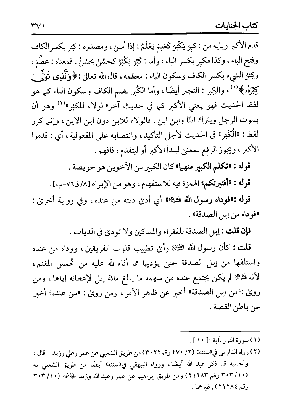 قدم الأكبر وبابه من: كَبِرَ يَكْبَرُ كَعَلِمَ يَعْلَمُ: إذا أسن، ومصدره: كِبَر بكسر الكاف وفتح الباء، وكذا مكبِر بكسر الباء، وأما: كَبرَ يَكْبُرُ كحسُنَ يحسْنُ، فمعناه: عظُمَ، وكِبْرُ الشيء بكسر الكاف وسكون الباء: معظمه، قال الله تعالى: {وَالَّذِي تَوَلَّى كِبْرَهُ} (¬1)، والكِبْر: التجبر أيضًا، وأما الكُبر بضم الكاف وسكون الباء كما هو لفظ الحديث فهو يعني الأكبر كما في حديث آخر "الولاء للكبْر" (¬2) وهو أن يموت الرجل ويترك ابنًا وابن ابن، فالولاء للابن دون ابن الابن، وإنما كرر لفظ: "الكُبْرَ" في الحديث لأجل التأكيد، وانتصابه على المفعولية، أي: قدموا الأكبر، ويجوز الرفع بمعنى ليبدأ الأكبر أو ليتقدم؛ فافهم.