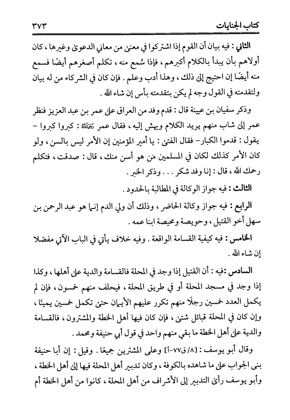 الخامس: فيه كيفية القسامة الواقعة. وفيه خلاف يأتي في الباب الآتي مفصلًا إن شاء الله.