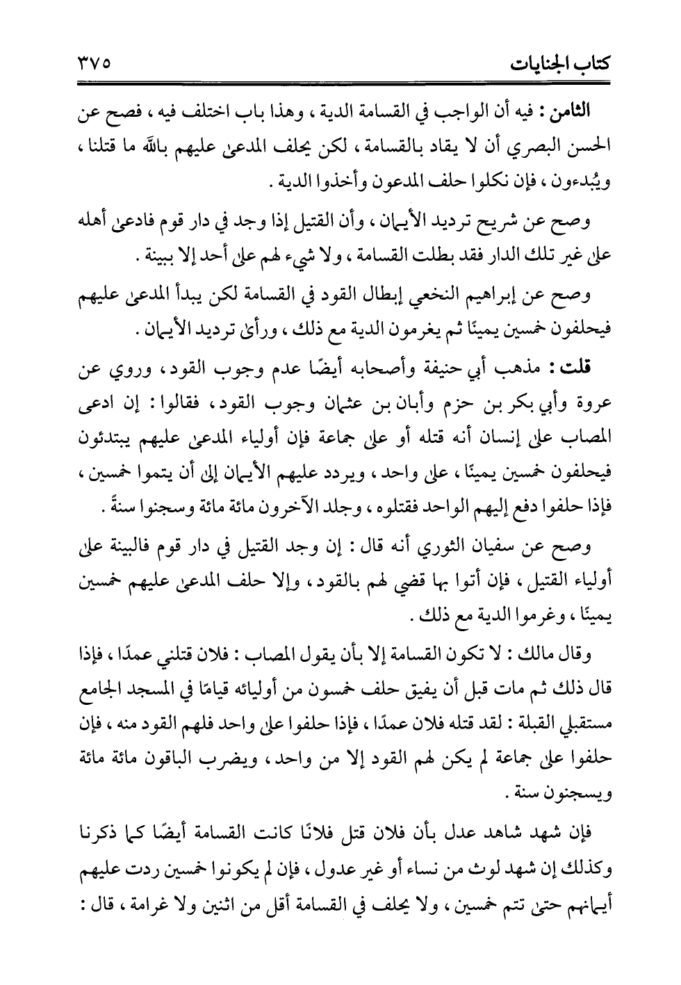 وصح عن شريح ترديد الأيمان، وأن القتيل إذا وجد في دار قوم فادعى أهله على غير تلك الدار فقد بطلت القسامة، ولا شيء لهم على أحد إلا ببينة.