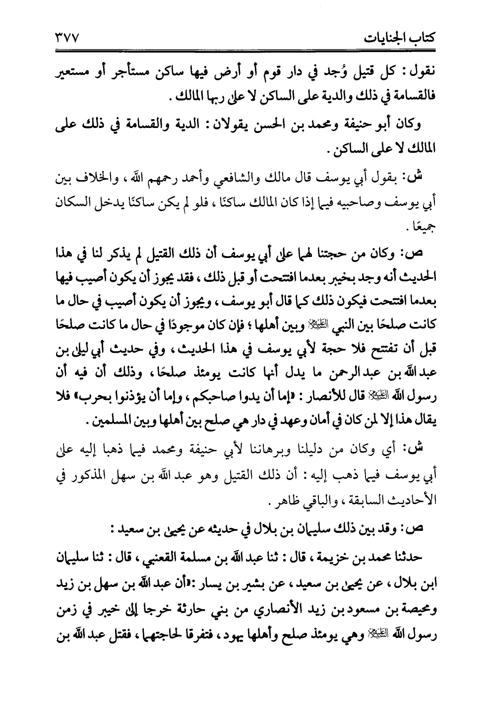 ص: وكان من حجتنا لهما على أبي يوسف أن ذلك القتيل لم يذكر لنا في هذا الحديث أنه وجد بخيبر بعد ما افتتحت أو قبل ذلك، فقد يجوز أن يكون أصيب فيها بعدما افتتحت فيكون ذلك كما قال أبو يوسف، ويجوز أن يكون أصيب في حال ما كانت صلحًا بين النبي -عليه السلام- وبين أهلها؛ فإن كان موجودًا في حال ما كانت صلحًا قبل أن تفتتح فلا حجة لأبي يوسف في هذا الحديث، وفي حديث أبي ليلى بن عبد الله بن عبد الرحمن ما يدل أنها كانت يومئذ صلحًا، وذلك أن فيه أن رسول الله -عليه السلام- قال للأنصار: "إما أن يدوا صاحبكم، وإما أن يؤذنوا بحرب" فلا يقال هذا إلا لمن كان في أمان وعهد في دار هي صلح بين أهلها وبين المسلمين.