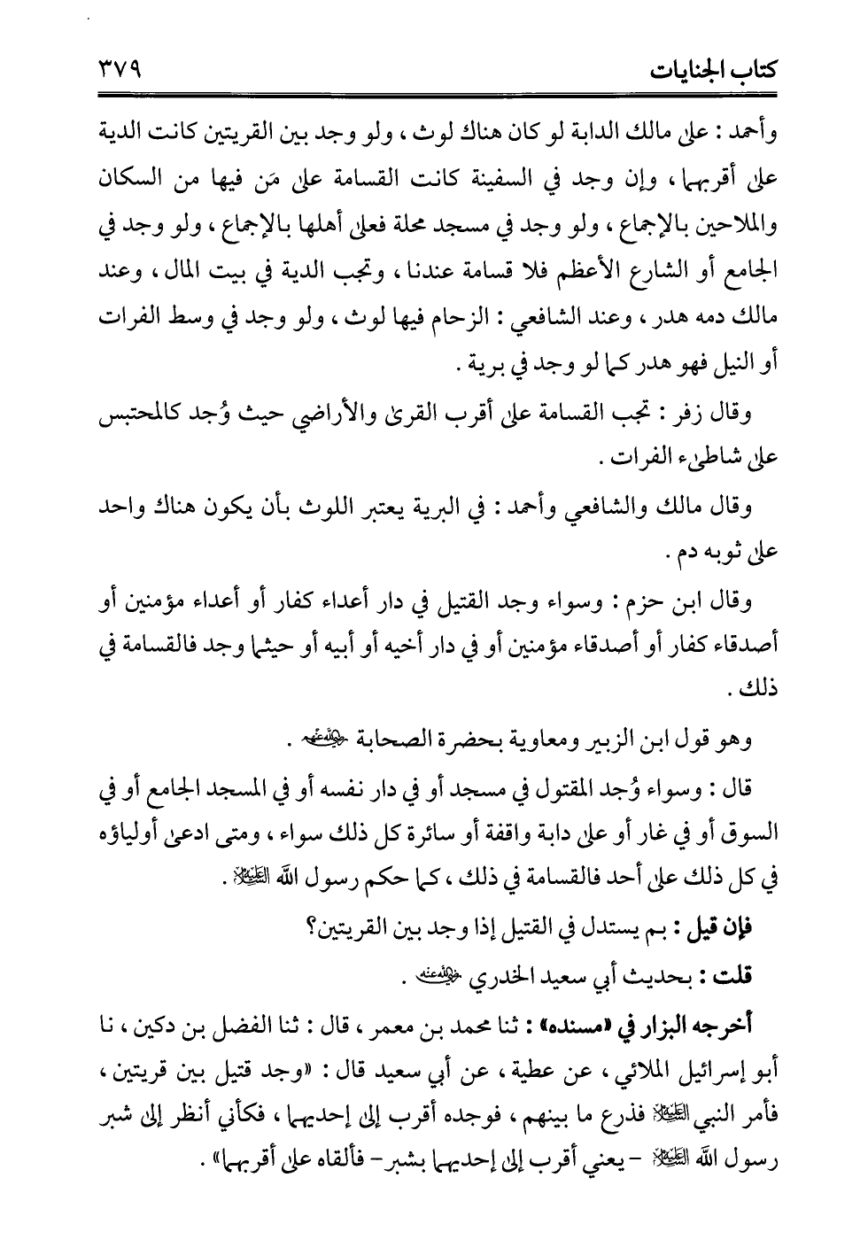 قال: وسواء وُجد المقتول في مسجد أو في دار نفسه أو في المسجد الجامع أو في السوق أو في غار أو على دابة واقفة أو سائرة كل ذلك سواء، ومتى ادعى أولياؤه في كل ذلك على أحد فالقسامة في ذلك، كما حكم رسول الله -عليه السلام-.