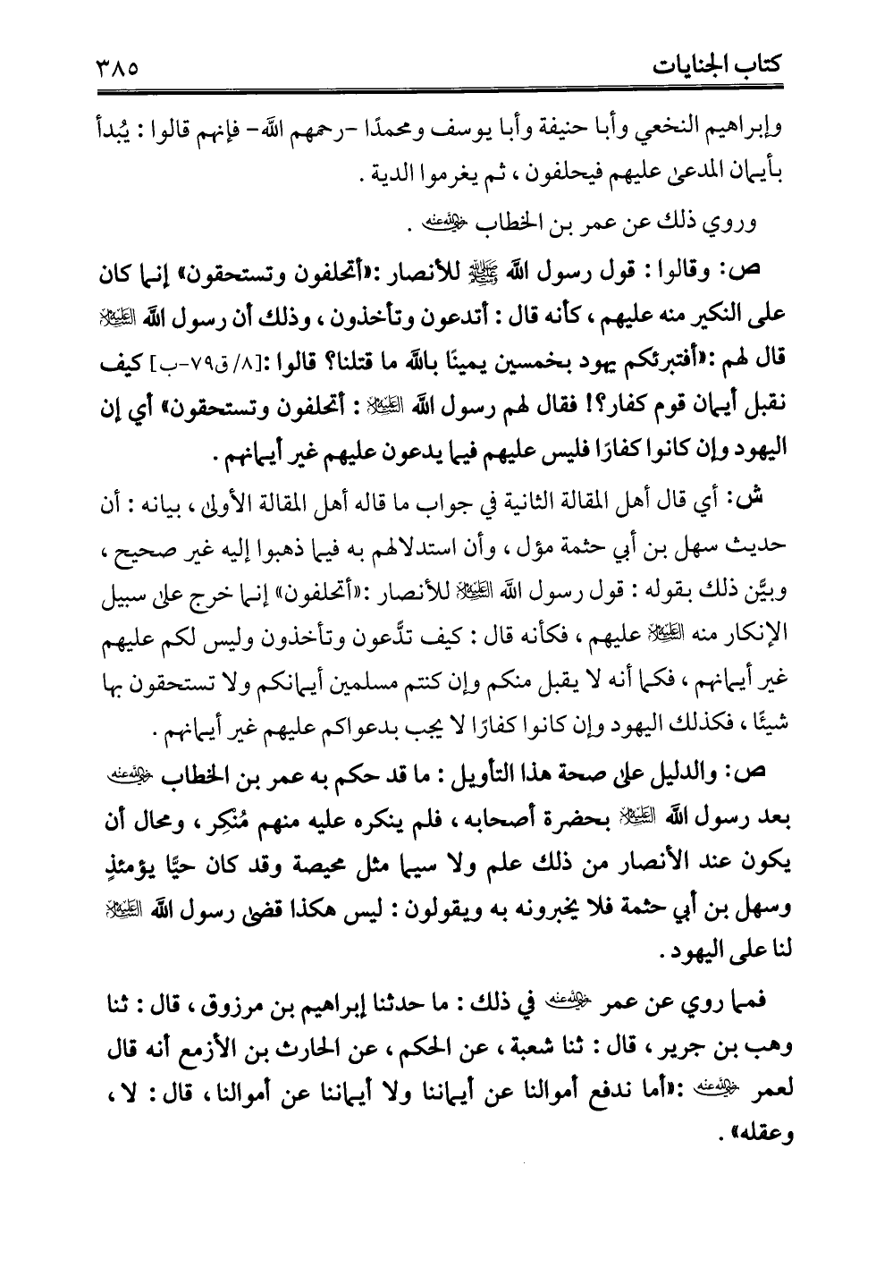 ص: وقالوا: قول رسول الله - صلى الله عليه وسلم - للأنصار: "أتحلفون وتستحقون" إنما كان على النكير منه عليهم، كأنه قال: أتدعون وتأخذون، وذلك أن رسول الله -عليه السلام- قال لهم: "أفتبرئكم عود بخمسين يمينًا بالله ما قتلنا؟ قالوا: كيف نقبل أيمان قوم كفار؟! فقال لهم رسول الله -عليه السلام-: أتحلفون وتستحقون" أي إن اليهود وإن كانوا كفارًا فليس عليهم فيما يدعون عليهم غير أيمانهم.