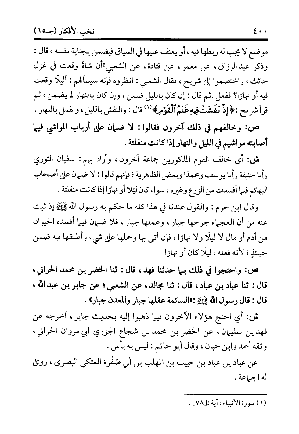 موضع لا يجب له ربطها فيه، أو يعنف عليها في السياق فيضمن بجناية نفسه، قال: وذكر عبد الرزاق، عن معمر، عن قتادة، عن الشعبي "أن شاةً وقعت في غزل حائك، واختصموا إلى شريح، فقال الشعبي: انظروه فإنه سيسألهم: أليلًا وقعت فيه أو نهارًا؟ ففعل. ثم قال: إن كان بالليل ضمن، وإن كان بالنهار لم يضمن، ثم قرأ شريح: {إِذْ نَفَشَتْ فِيهِ غَنَمُ الْقَوْمِ} (¬1) قال: والنفش بالليل، والهمل بالنهار.