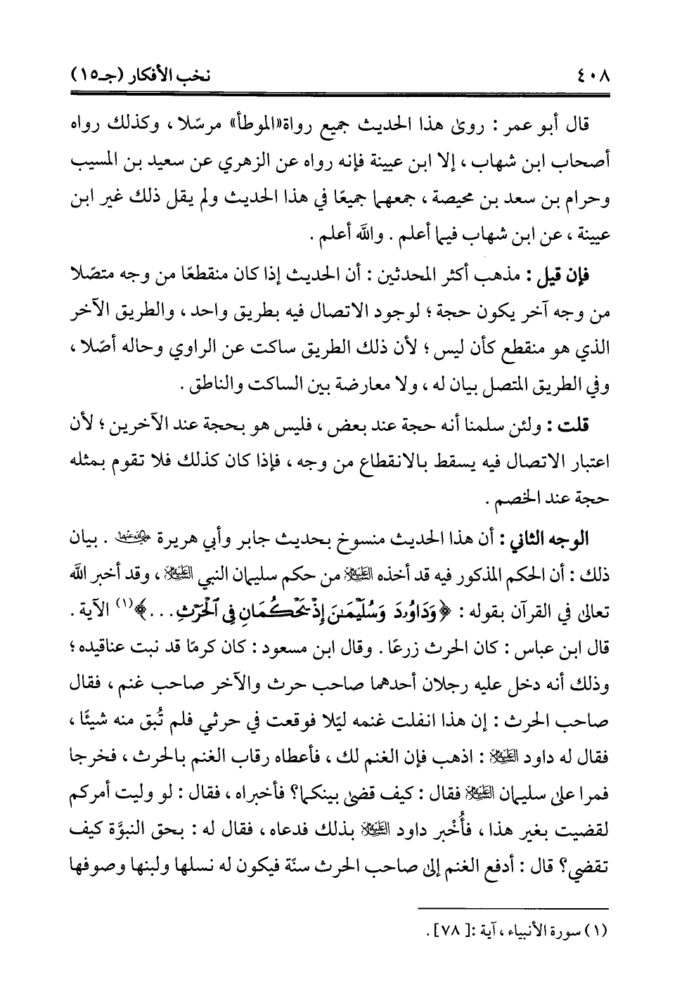 الوجه الثاني: أن هذا الحديث منسوخ بحديث جابر وأبي هريرة - رضي الله عنهما -. بيان ذلك: أن الحكم المذكور فيه قد أخذه -عليه السلام- من حكم سليمان النبي -عليه السلام-، وقد أخبر الله تعالى في القرآن بقوله: {وَدَاوُودَ وَسُلَيْمَانَ إِذْ يَحْكُمَانِ فِي الْحَرْثِ. . . .} (¬1) الآية. قال ابن عباس: كان الحرث زرعًا. وقال ابن مسعود: كان كرمًا قد نبت عناقيده؛ وذلك أنه دخل عليه رجلان أحدهما صاحب حرث والآخر صاحب غنم، فقال صاحب الحرث: إن هذا انفلت غنمه ليلًا فوقعت في حرثي فلم تُبق منه شيئًا، فقال له داود -عليه السلام-: اذهب فإن الغنم لك، فأعطاه رقاب الغنم بالحرث، فخرجا فمرا على سليمان -عليه السلام- فقال: كيف قضى بينكما؟ فأخبراه، فقال: لو وليت أمركم لقضيت بغير هذا، فأُخبر داود -عليه السلام- بذلك فدعاه، فقال له: بحق النبوَّة كيف تقضي؟ قال: أدفع الغنم إلى صاحب الحرث سنةً فيكون له نسلها ولبنها وصوفها