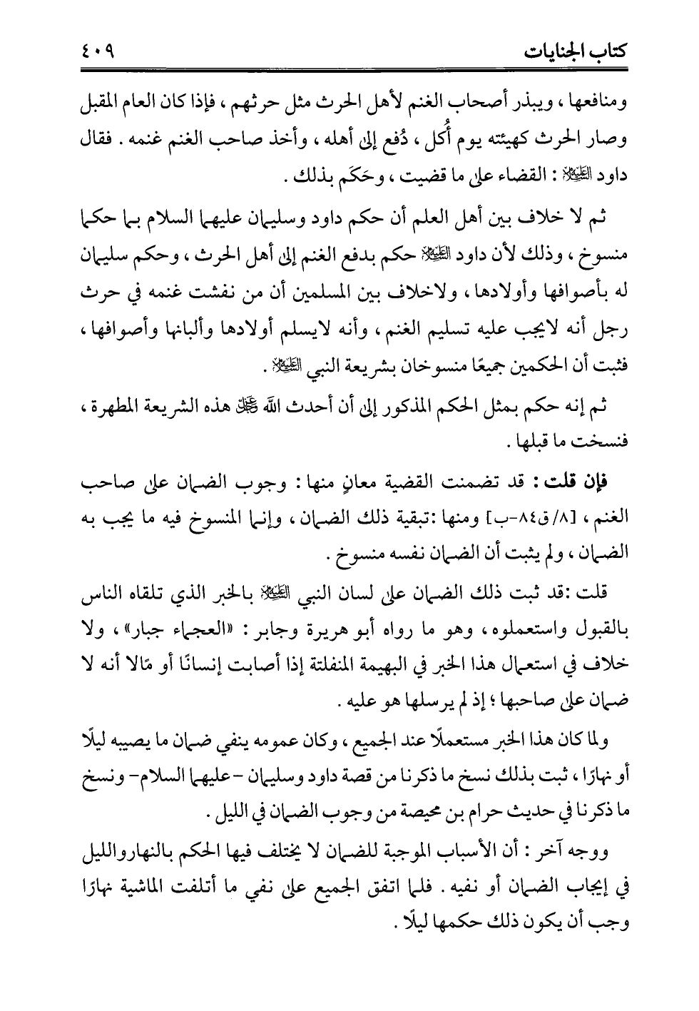 فإن قلت: قد تضمنت القضية معانٍ منها: وجوب الضمان على صاحب الغنم، ومنها: تبقية ذلك الضمان، وإنما المنسوخ فيه ما يجب به الضمان، ولم يثبت أن الضمان نفسه منسوخ.