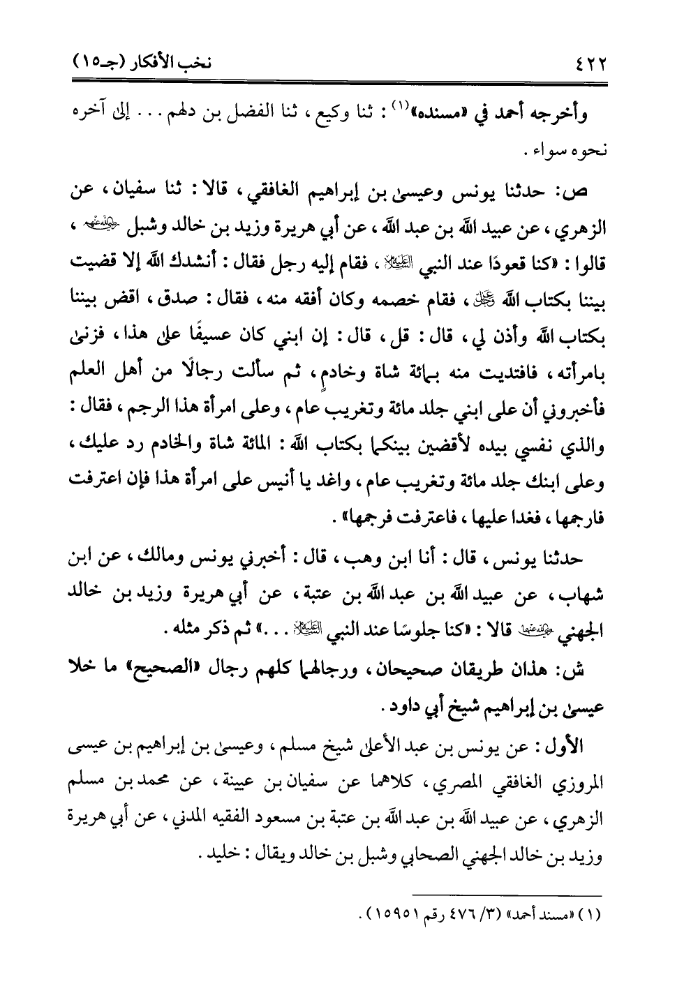 ص: حدثنا يونس وعيسى بن إبراهيم الغافقي، قالا: ثنا سفيان، عن الزهري، عن عبيد الله بن عبد الله، عن أبي هريرة وزيد بن خالد وشبل - رضي الله عنهم -، قالوا: "كنا قعودًا عند النبي -عليه السلام-، فقام إليه رجل فقال: أنشدك الله إلا قضيت بيننا بكتاب الله -عز وجل-، فقام خصمه وكان أفقه منه، فقال: صدق، اقض بيننا بكتاب الله وأذن لي، قال: قل، قال: إن ابني كان عسيفًا على هذا، فزنى بامرأته، فافتديت منه بمائة شاة وخادمٍ، ثم سألت رجالًا من أهل العلم فأخبروني أن على ابني جلد مائة وتغريب عام، وعلى امرأة هذا الرجم، فقال: والذي نفسي بيده لأقضين بينكما بكتاب الله: المائة شاة والخادم رد عليك، وعلى ابنك جلد مائة وتغريب عام، واغد يا أنيس على امرأة هذا فإن اعترفت فارجمها، فغدا عليها، فاعترفت فرجمها".