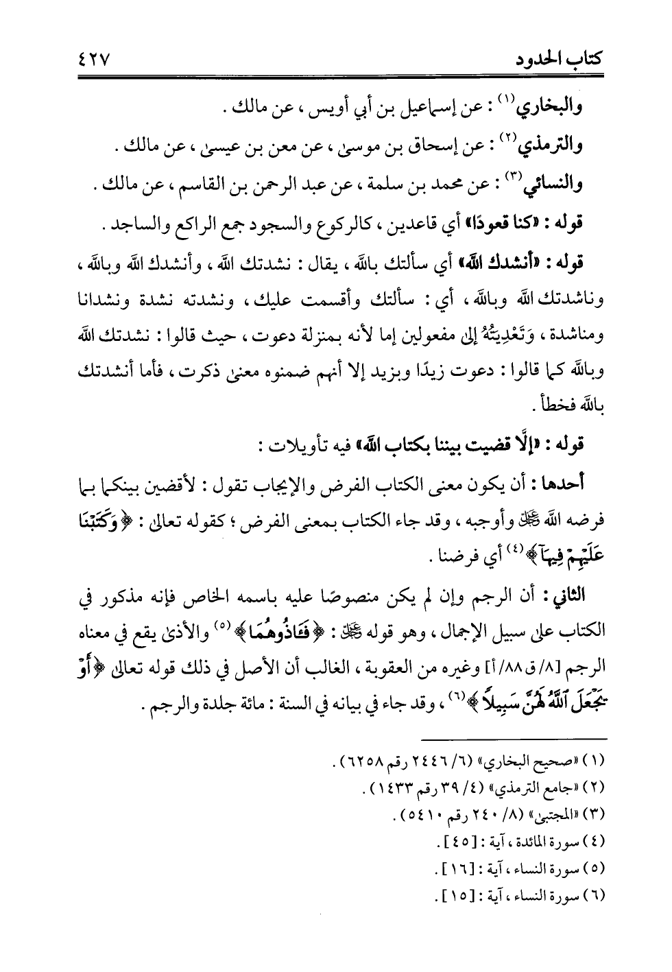 أحدها: أن يكون معنى الكتاب الفرض والإيجاب تقول: لأقضين بينكما بما فرضه الله -عز وجل- وأوجبه، وقد جاء الكتاب بمعنى الفرض؛ كقوله تعالى: {وَكَتَبْنَا عَلَيْهِمْ فِيهَا} (¬4) أي فرضنا.