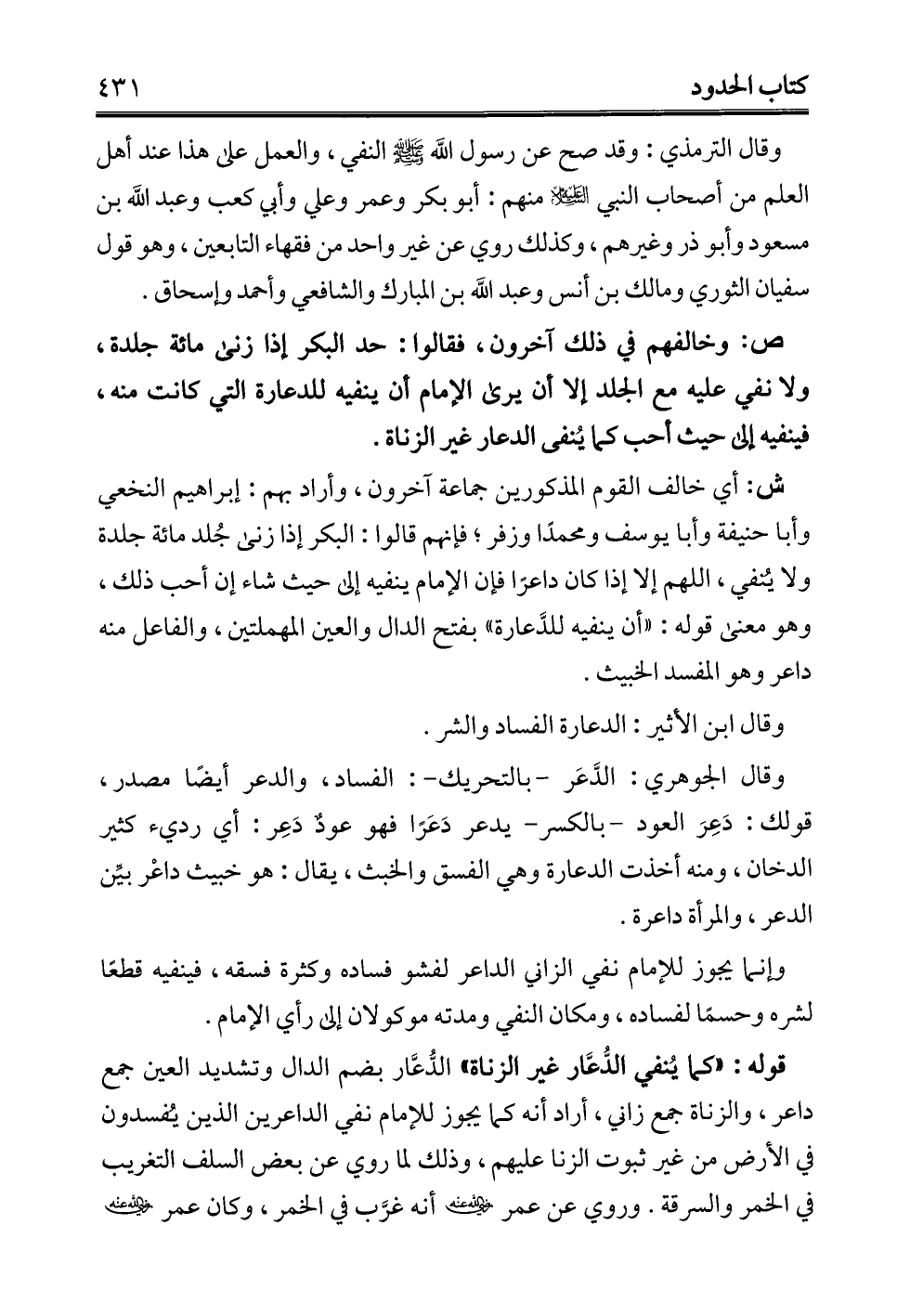 قوله: "كما يُنفي الدُّعَّار غير الزناة" الدُّعَّار بضم الدال وتشديد العين جمع داعر، والزناة جمع زاني، أراد أنه كما يجوز للإمام نفي الداعرين الذين يُفسدون في الأرض من غير ثبوت الزنا عليهم، وذلك لما روي عن بعض السلف التغريب في الخمر والسرقة. وروي عن عمر - رضي الله عنه - أنه غرَّب في الخمر، وكان عمر - رضي الله عنه -