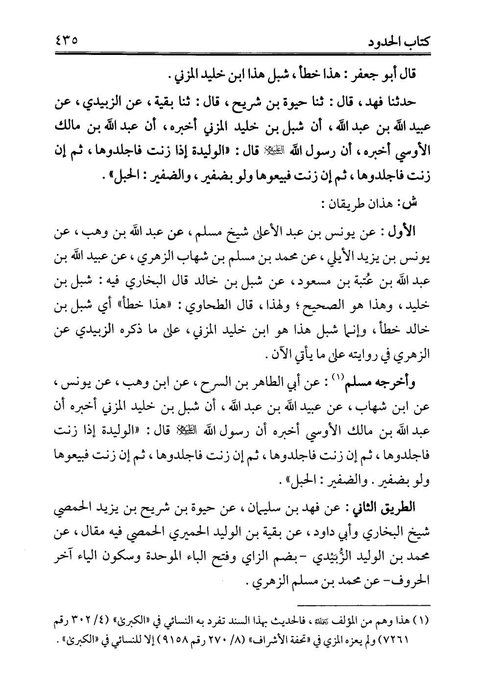 حدثنا فهد، قال: ثنا حيوة بن شريح، قال: ثنا بقية، عن الزبيدي، عن عبيد الله بن عبد الله، أن شبل بن خليد المزني أخبره، أن عبد الله بن مالك الأوسي أخبره، أن رسول الله -عليه السلام- قال: "الوليدة إذا زنت فاجلدوها، ثم إن زنت فاجلدوها، ثم إن زنت فبيعوها ولو بضفير، والضفير: الحبل".