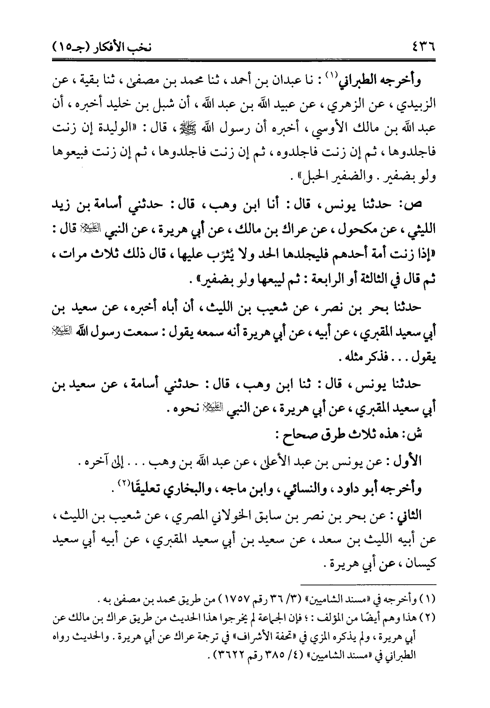 وأخرجه الطبراني (¬1): نا عبدان بن أحمد، ثنا محمَّد بن مصفى، ثنا بقية، عن الزبيدي، عن الزهري، عن عبيد الله بن عبد الله، أن شبل بن خليد أخبره، أن عبد الله بن مالك الأوسي، أخبره أن رسول الله - صلى الله عليه وسلم -، قال: "الوليدة إن زنت فاجلدوها، ثم إن زنت فاجلدوه، ثم إن زنت فاجلدوها، ثم إن زنت فبيعوها ولو بضفير. والضفير الحبل".