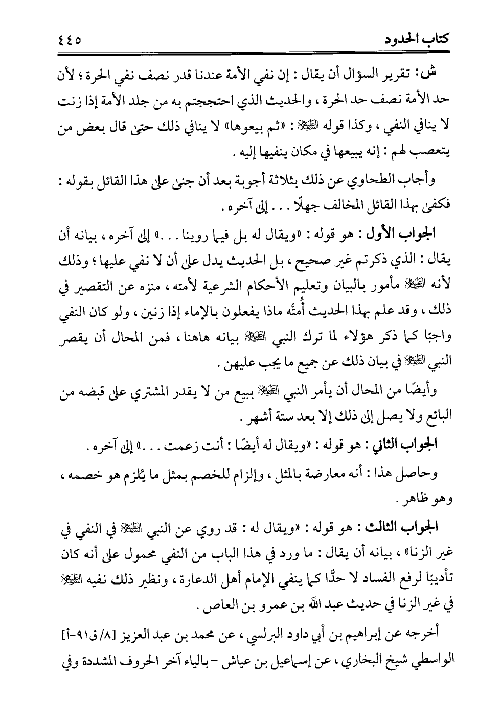 الجواب الأول: هو قوله: "ويقال له بل فيما روينا. . . ." إلى آخره، بيانه أن يقال: الذي ذكرتم غير صحيح، بل الحديث يدل على أن لا نفي عليها؛ وذلك لأنه -عليه السلام- مأمور بالبيان وتعليم الأحكام الشرعية لأمته، منزه عن التقصير في ذلك، وقد علم بهذا الحديث أُمتَّه ماذا يفعلون بالإماء إذا زنين، ولو كان النفي واجبًا كما ذكر هؤلاء لما ترك النبي -عليه السلام- بيانه هاهنا، فمن المحال أن يقصر النبي -عليه السلام- في بيان ذلك عن جميع ما يجب عليهن.