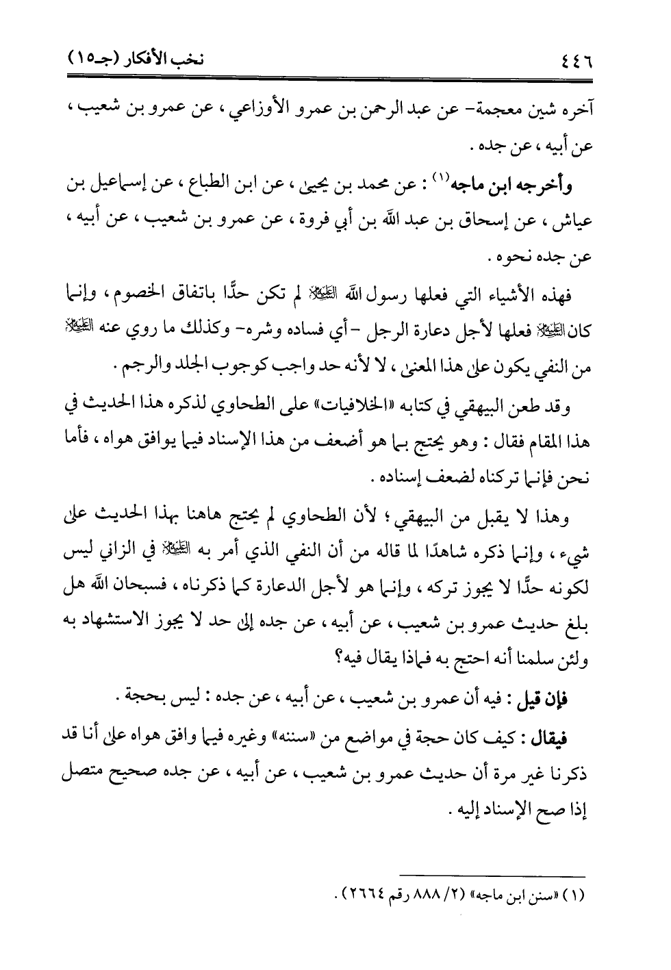 وهذا لا يقبل من البيهقي؛ لأن الطحاوي لم يحتج هاهنا بهذا الحديث على شيء، وإنما ذكره شاهدًا لما قاله من أن النفي الذي أمر به -عليه السلام- في الزاني ليس لكونه حدًّا لا يجوز تركه، وإنما هو لأجل الدعارة كما ذكرناه، فسبحان الله هل بلغ حديث عمرو بن شعيب، عن أبيه، عن جده إلى حد لا يجوز الاستشهاد به ولئن سلمنا أنه احتج به فماذا يقال فيه؟