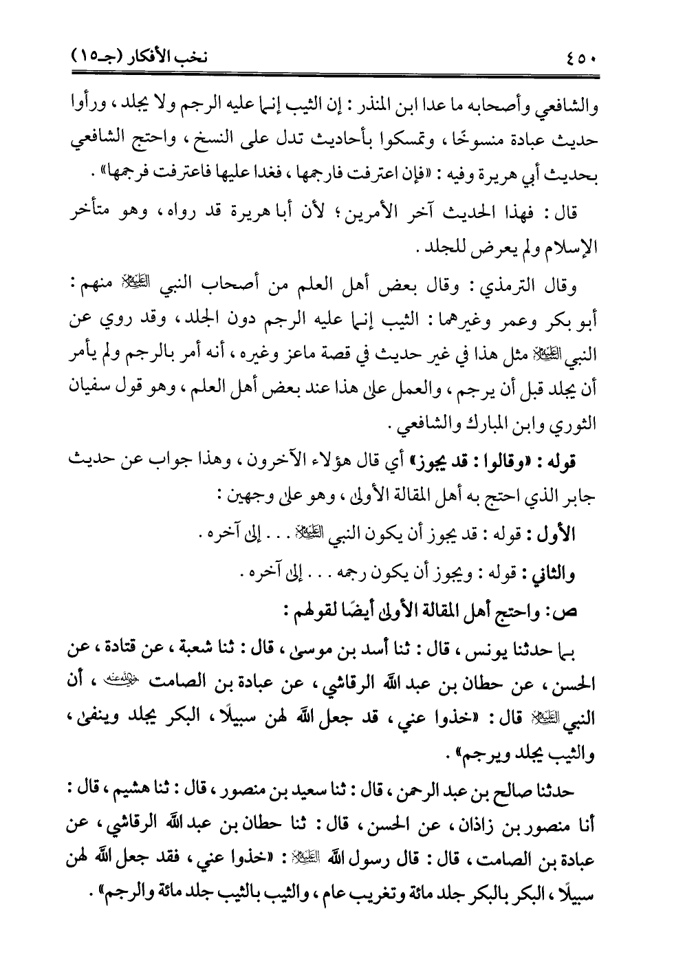وقال الترمذي: وقال بعض أهل العلم من أصحاب النبي -عليه السلام- منهم: أبو بكر وعمر وغيرهما: الثيب إنما عليه الرجم دون الجلد، وقد روي عن النبي -عليه السلام- مثل هذا في غير حديث في قصة ماعز وغيره، أنه أمر بالرجم ولم يأمر أن يجلد قبل أن يرجم، والعمل على هذا عند بعض أهل العلم، وهو قول سفيان الثوري وابن المبارك والشافعي.