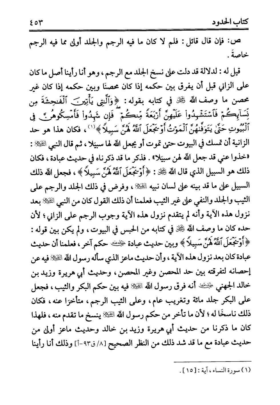 قيل له: لدلالة قد دلت على نسخ الجلد مع الرجم، وهو أنا رأينا أصل ما كان على الزاني قبل أن يفرق بين حكمه إذا كان محصنًا وبين حكمه إذا كان غير محصن ما وصف الله -عز وجل- في كتابه بقوله: {وَاللَّاتِي يَأْتِينَ الْفَاحِشَةَ مِنْ نِسَائِكُمْ فَاسْتَشْهِدُوا عَلَيْهِنَّ أَرْبَعَةً مِنْكُمْ فَإِنْ شَهِدُوا فَأَمْسِكُوهُنَّ فِي الْبُيُوتِ حَتَّى يَتَوَفَّاهُنَّ الْمَوْتُ أَوْ يَجْعَلَ اللَّهُ لَهُنَّ سَبِيلًا} (¬1)، فكان هذا هو حد الزانية أن تمسك في البيوت حتى تموت أو يجعل الله لها سبيلًا، ثم قال النبي -عليه السلام-: "خذوا عني قد جعل الله لهن سبيلًا". فذكر ما قد ذكرناه في حديث عبادة، فكان ذلك هو السبيل الذي قال الله -عز وجل- {أَوْ يَجْعَلَ اللَّهُ لَهُنَّ سَبِيلًا}، فجعل الله ذلك السبيل على ما قد بينه على لسان نبيه -عليه السلام-، وفرض في ذلك الجلد والرجم على الثيب والجلد والنفي على غير الثيب فعلمنا أن ذلك القول كان من النبي -عليه السلام- بعد نزول هذه الآية وأنه لم يتقدم نزول هذه الآية وجوب الرجم على الزاني؛ لأن حده كان ما وصف الله -عز وجل- في كتابه من الحبس في البيوت، ولم يكن بين قوله: {أَوْ يَجْعَلَ اللَّهُ لَهُنَّ سَبِيلًا} وبين حديث عبادة - رضي الله عنه - حكم آخر، فعلمنا أن حديث عبادة كان بعد نزول هذه الآية، وأن حديث ماعز الذي سأله رسول الله -عليه السلام- فيه عن إحصانه لتفرقته بين حد المحصن وغير المحصن، وحديث أبي هريرة وزيد بن خالد الجهني -رضي الله عنهما- أنه فرق رسول الله -عليه السلام- فيه بين حكم البكر والثيب، فجعل على البكر جلد مائة وتغريب عام، وعلى الثيب الرجم، متأخرًا عنه، فكان ذلك ناسخًا له؛ لأن ما تأخر من حكم رسول الله -عليه السلام- ينسخ ما تقدم منه، فلهذا كان ما ذكرنا من حديث أبي هريرة وزيد بن خالد وحديث ماعز أولى من حديث عبادة مع ما قد شد ذلك من النظر الصحيح وذلك أنا رأينا
