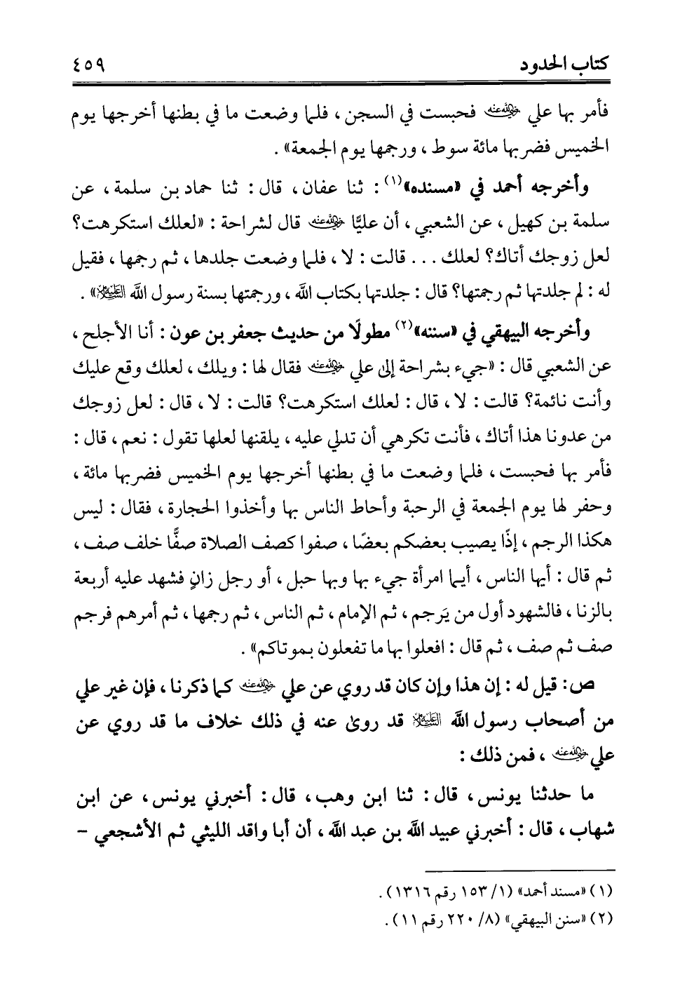 وأخرجه أحمد في "مسنده" (¬1): ثنا عفان، قال: ثنا حماد بن سلمة، عن سلمة بن كهيل، عن الشعبي، أن عليًّا - رضي الله عنه - قال لشراحة: "لعلك استكرهت؟ لعل زوجك أتاك؟ لعلك. . . . قالت: لا، فلما وضعت جلدها، ثم رجمها، فقيل له: لم جلدتها ثم رجمتها؟ قال: جلدتها بكتاب الله، ورجمتها بسنة رسول الله -عليه السلام-".