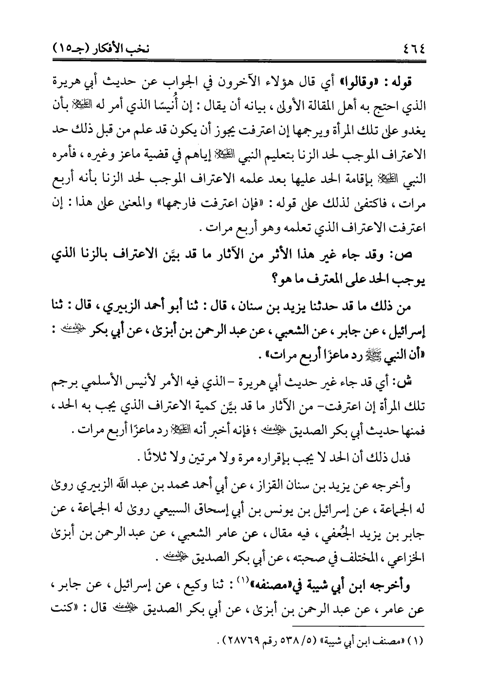ش: أي قد جاء غير حديث أبي هريرة -الذي فيه الأمر لأنيس الأسلمي برجم تلك المرأة إن اعترفت- من الآثار ما قد بيَّن كمية الاعتراف الذي يجب به الحد، فمنها حديث أبي بكر الصديق - رضي الله عنه -؛ فإنه أخبر أنه -عليه السلام- رد ماعزًا أربع مرات.