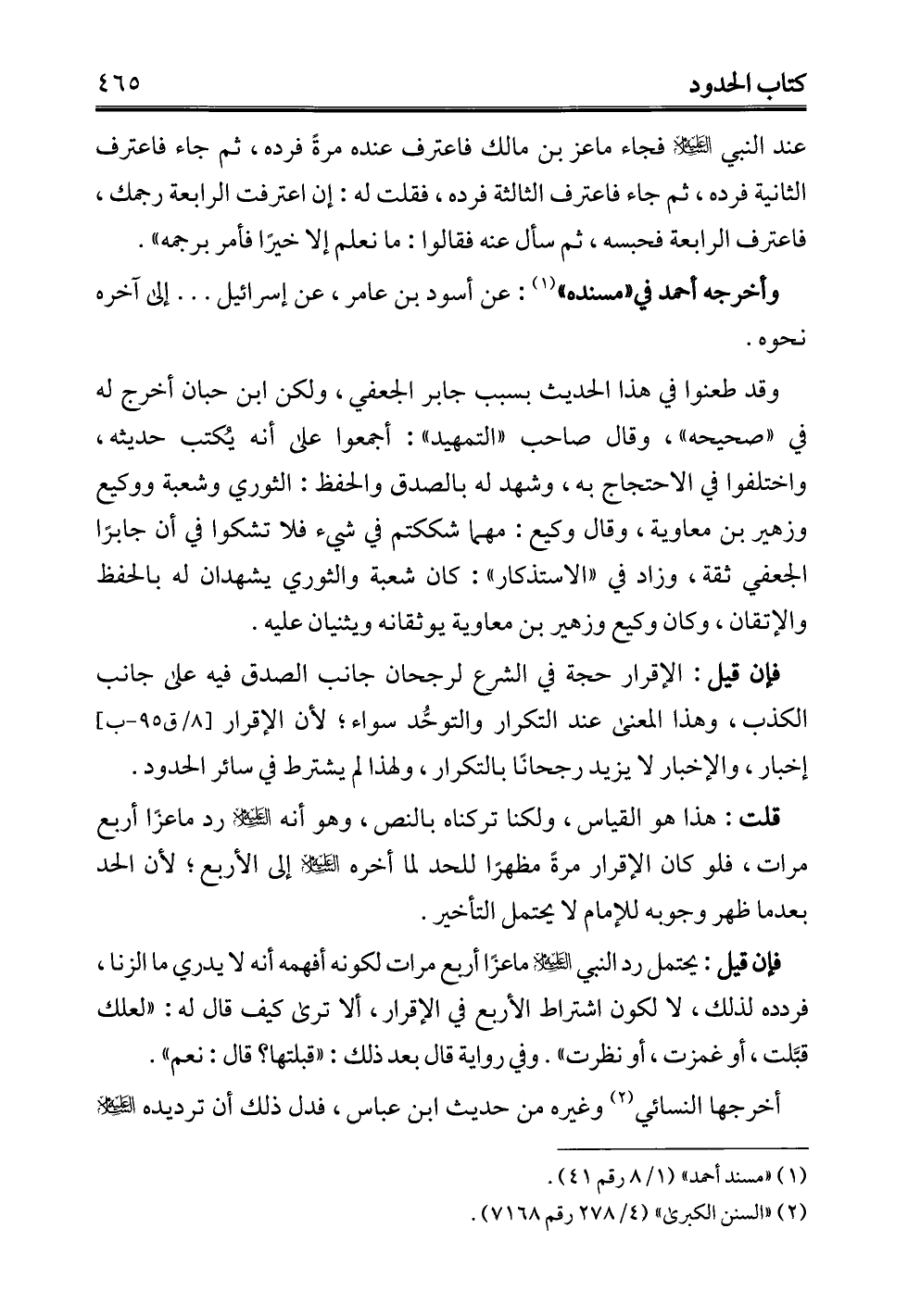 فإن قيل: يحتمل رد النبي -عليه السلام- ماعزًا أربع مرات لكونه أفهمه أنه لا يدري ما الزنا، فردده لذلك، لا لكون اشتراط الأربع في الإقرار، ألا ترى كيف قال له: "لعلك قبَّلت، أو غمزت، أو نظرت". وفي رواية قال بعد ذلك: "قبلتها؟ قال: نعم".
