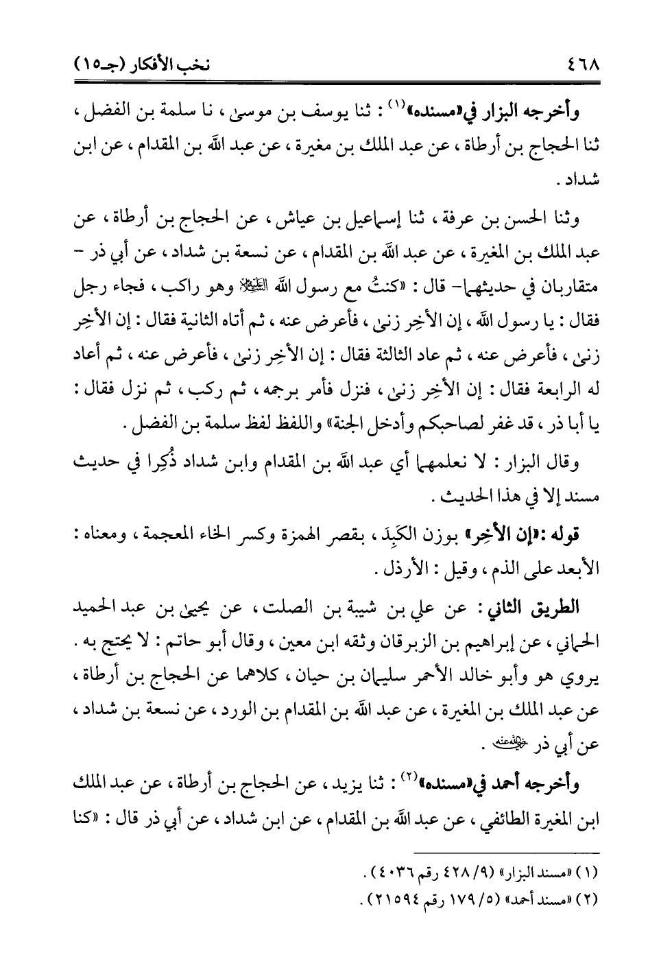 وثنا الحسن بن عرفة، ثنا إسماعيل بن عياش، عن الحجاج بن أرطاة، عن عبد الملك بن المغيرة، عن عبد الله بن المقدام، عن نسعة بن شداد، عن أبي ذر -متقاربان في حديثهما- قال: "كنتُ مع رسول الله -عليه السلام- وهو راكب، فجاء رجل فقال: يا رسول الله، إن الأخِر زنى، فأعرض عنه، ثم أتاه الثانية فقال: إن الأخِر زنى، فأعرض عنه، ثم عاد الثالثة فقال: إن الأخِر زنى، فأعرض عنه، ثم أعاد له الرابعة فقال: إن الأخِر زنى، فنزل فأمر برجمه، ثم ركب، ثم نزل فقال: يا أبا ذر، قد غفر لصاحبكم وأدخل الجنة" واللفظ لفظ سلمة بن الفضل.