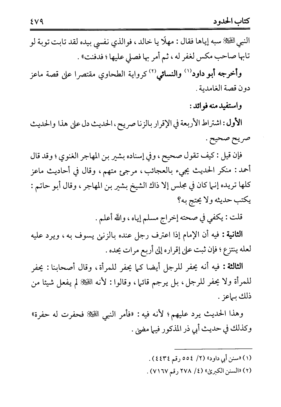 وأخرجه أبو داود (¬1) والنسائي (¬2) كرواية الطحاوي مقتصرا على قصة ماعز دون قصة الغامدية.