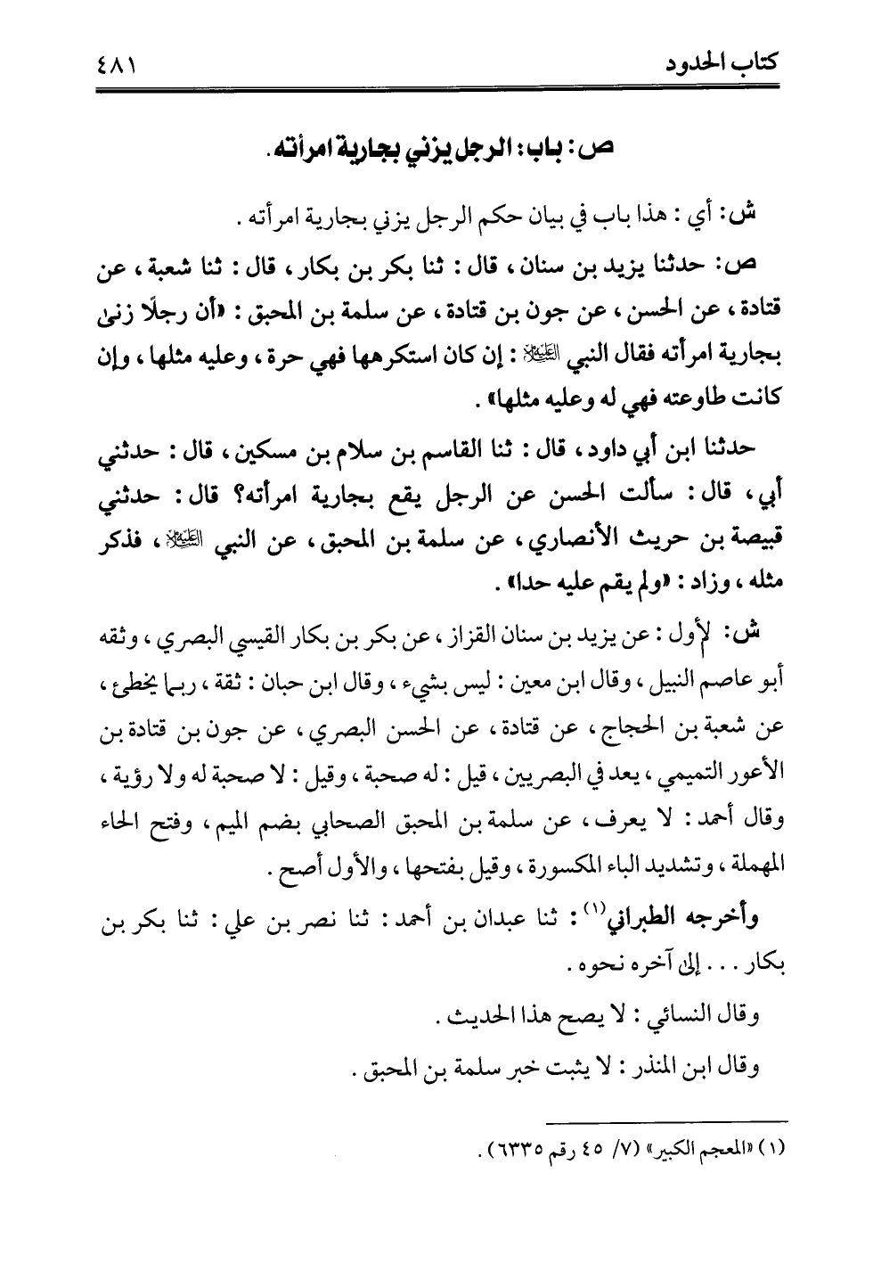 حدثنا ابن أبي داود، قال: ثنا القاسم بن سلام بن مسكين، قال: حدثني أبي، قال: سألت الحسن عن الرجل يقع بجارية امرأته؟ قال: حدثني قبيصة بن حريث الأنصاري، عن سلمة بن المحبق، عن النبي -عليه السلام-، فذكر مثله، وزاد: "ولم يقم عليه حدا".
