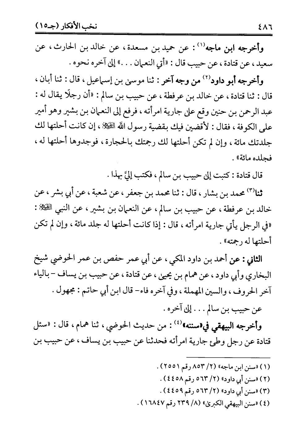 وأخرجه أبو داود (¬2) من وجه آخر: ثنا موسى بن إسماعيل، قال: ثنا أبان، قال: ثنا قتادة، عن خالد بن عرفطة، عن حبيب بن سالم: "أن رجلًا يقال له: عبد الرحمن بن حنين وقع على جارية امرأته، فرفع إلى النعمان بن بشير وهو أمير على الكوفة، فقال: لأقضين فيك بقضية رسول الله -عليه السلام-، إن كانت أحلتها لك جلدتك مائة، وإن لم تكن أحلتها لك رجمتك بالحجارة، فوجدوها أحلتها له، فجلده مائة".