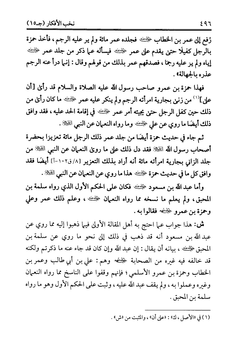 فهذا حمزة بن عمرو صاحب رسول الله -عليه الصلاة والسلام- قد رأى [أن على] (¬1) من زنى بجارية امرأته الرجم ولم ينكر عليه عمر - رضي الله عنه - ما كان رأى من ذلك حين كفل الرجل حتى يجيئه أمر عمر - رضي الله عنه - في إقامة الحد عليه، فقد وافق ذلك أيضًا ما روي عن علي - رضي الله عنه - وما رواه النعمان عن النبي -عليه السلام-.