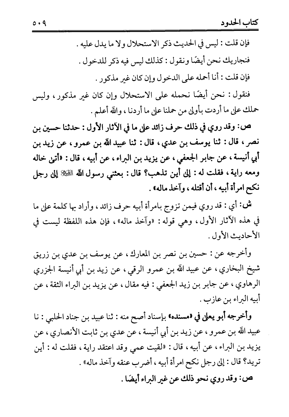 ص: وقد روي في ذلك حرف زائد على ما في الآثار الأول: حدثنا حسين بن نصر، قال: ثنا يوسف بن عدي، قال: ثنا عبيد الله بن عمرو، عن زيد بن أبي أنيسة، عن جابر الجعفي، عن يزيد بن البراء، عن أبيه، قال: "أتى خاله ومعه راية، فقلت له: إلى أين تذهب؟ قال: بعثني رسول الله -عليه السلام- إلى رجل نكح امرأة أبيه، أن أقتله، وآخذ ماله".