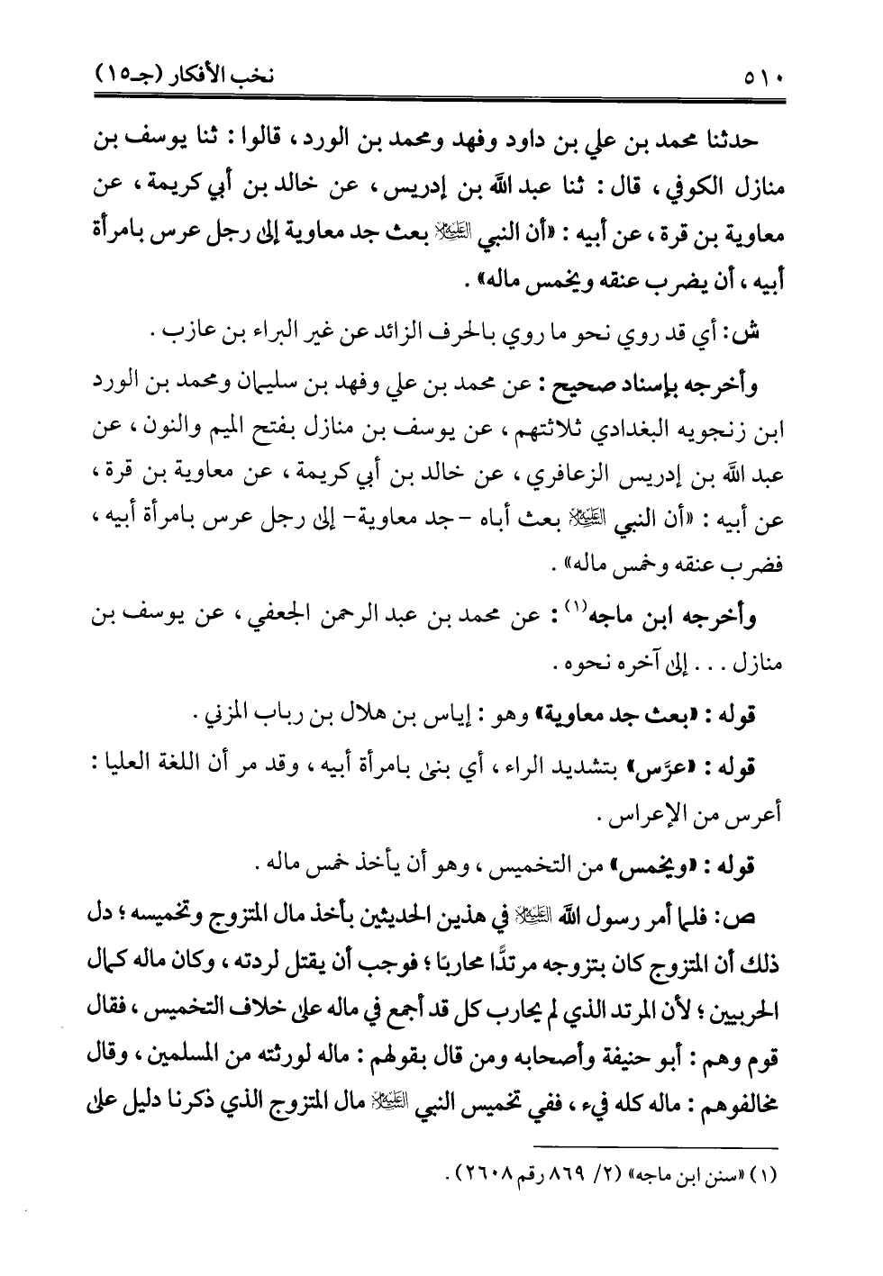 وأخرجه بإسناد صحيح: عن محمَّد بن علي وفهد بن سليمان ومحمد بن الورد ابن زنجويه البغدادي ثلاثتهم، عن يوسف بن منازل بفتح الميم والنون، عن عبد الله بن إدريس الزعافري، عن خالد بن أبي كريمة، عن معاوية بن قرة، عن أبيه: "أن النبي -عليه السلام- بعث أباه -جد معاوية- إلى رجل عرس بامرأة أبيه، فضرب عنقه وخمس ماله".