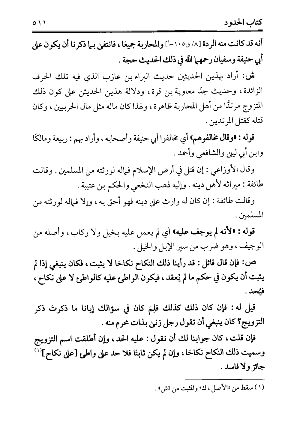 ش: أراد بهذين الحديثين حديث البراء بن عازب الذي فيه تلك الحرف الزائدة، وحديث جدّ معاوية بن قرة، ودلالة هذين الحديثين على كون ذلك المتزوج مرتدًّا من أهل المحاربة ظاهرة، ولهذا كان ماله مثل مال الحربيين، وكان قتله كقتل المرتدين.