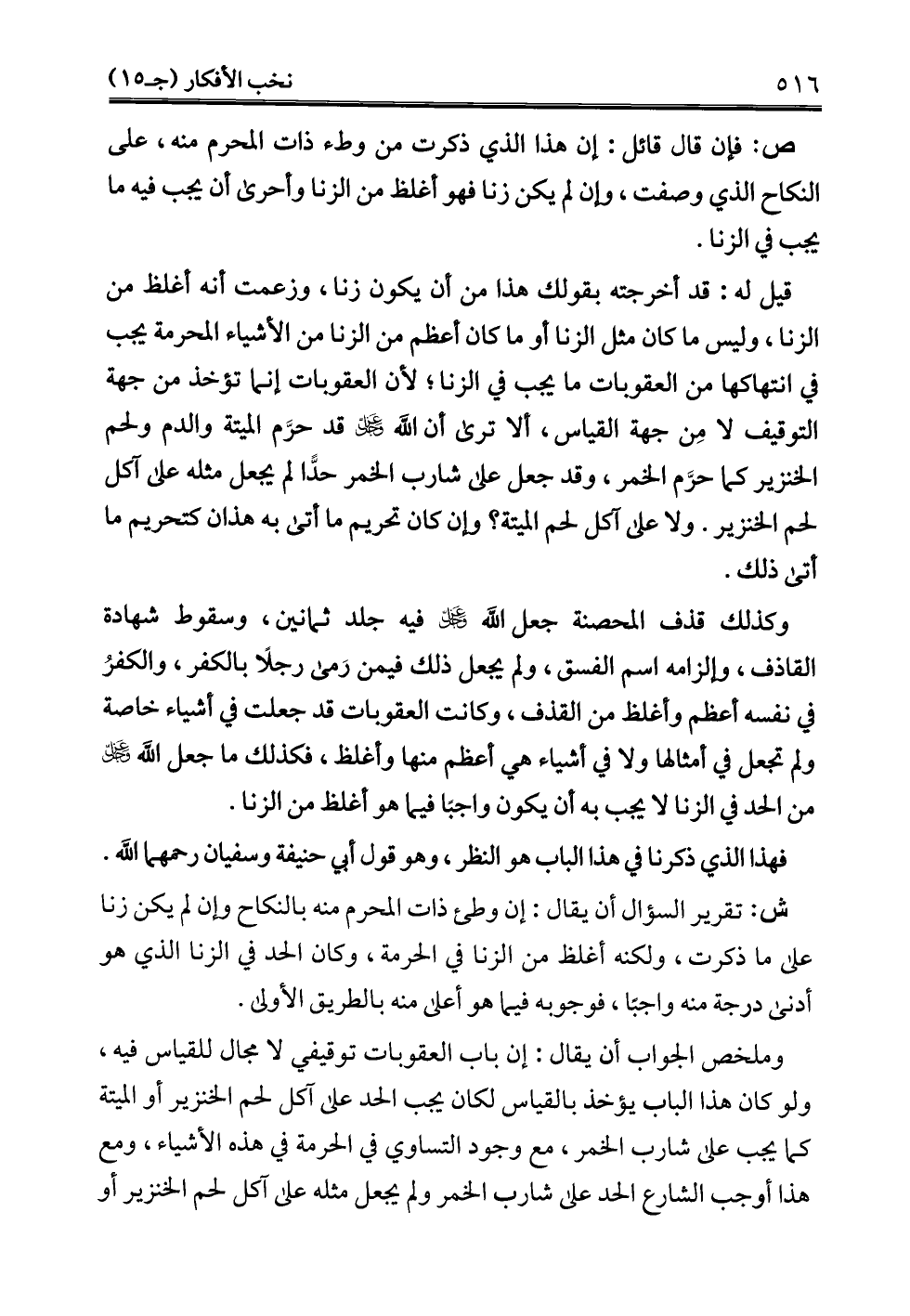 ش: تقرير السؤال أن يقال: إن وطئ ذات المحرم منه بالنكاح وإن لم يكن زنا على ما ذكرت، ولكنه أغلظ من الزنا في الحرمة، وكان الحد في الزنا الذي هو أدنى درجة منه واجبًا، فوجوبه فيما هو أعلى منه بالطريق الأولى.