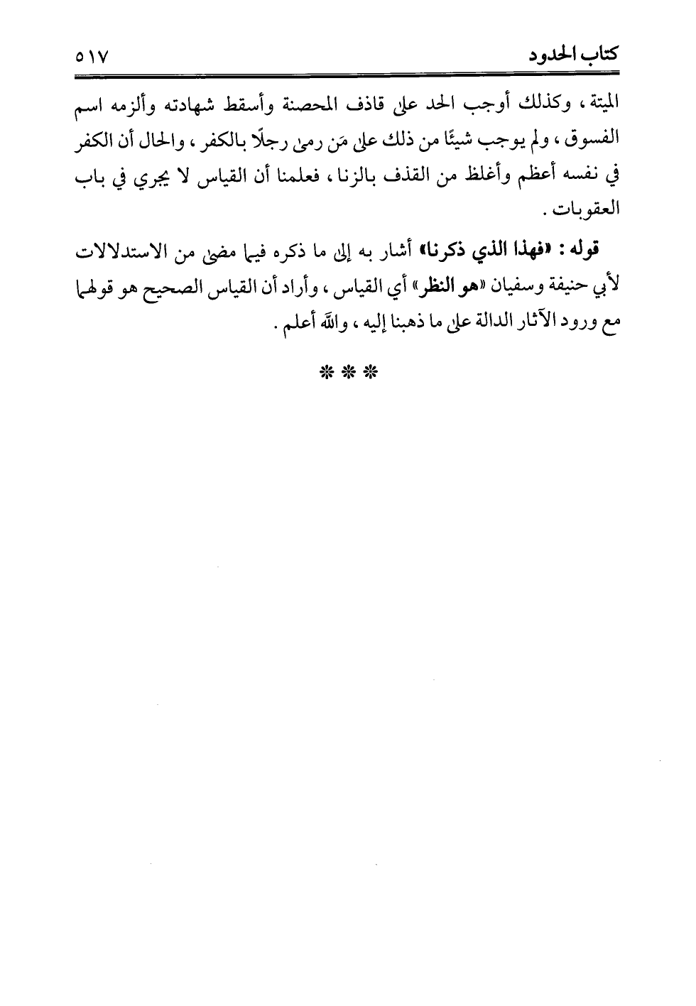 الميتة، وكذلك أوجب الحد على قاذف المحصنة وأسقط شهادته وألزمه اسم الفسوق، ولم يوجب شيئًا من ذلك على مَن رمى رجلًا بالكفر، والحال أن الكفر في نفسه أعظم وأغلظ من القذف بالزنا، فعلمنا أن القياس لا يجري في باب العقوبات.