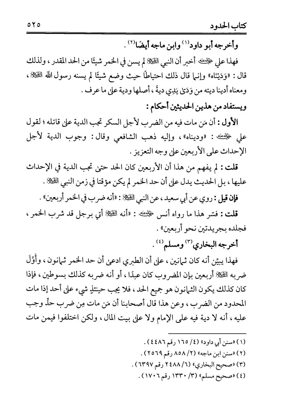 قلت: لم يفهم من هذا أن الأربعين كان الحد حتى تجب الدية في الإحداث عليها، بل الحديث يدل على أن حد الخمر لم يكن مؤقتا في زمن النبي -عليه السلام-.