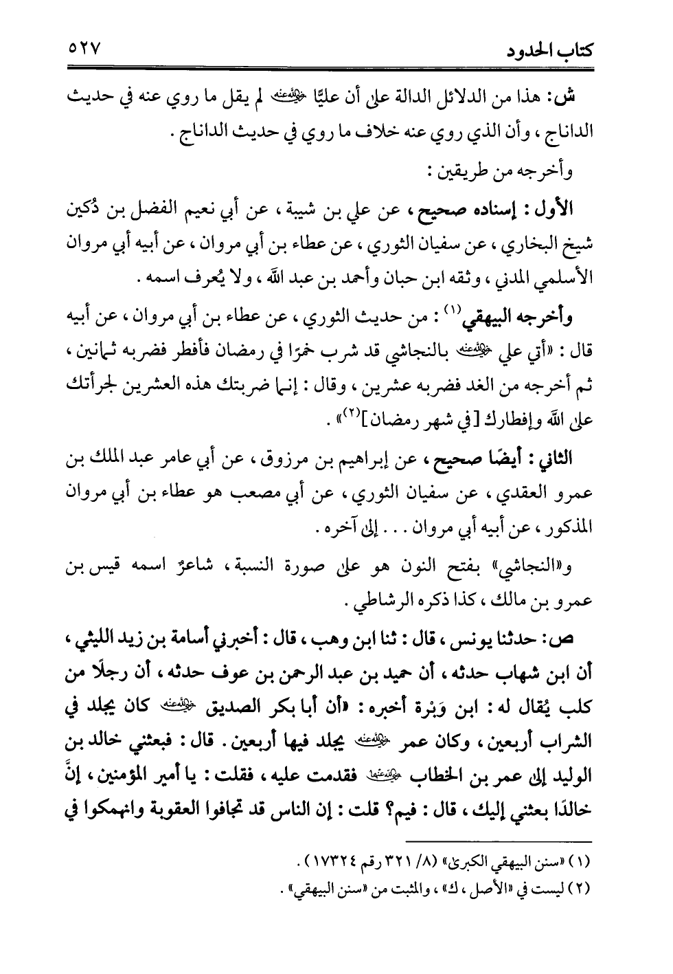 وأخرجه البيهقي (¬1): من حديث الثوري، عن عطاء بن أبي مروان، عن أبيه قال: "أتي علي - رضي الله عنه - بالنجاشي قد شرب خمرًا في رمضان فأفطر فضربه ثمانين، ثم أخرجه من الغد فضربه عشرين، وقال: إنما ضربتك هذه العشرين لجرأتك على الله وإفطارك [في شهر رمضان] (¬2) ".