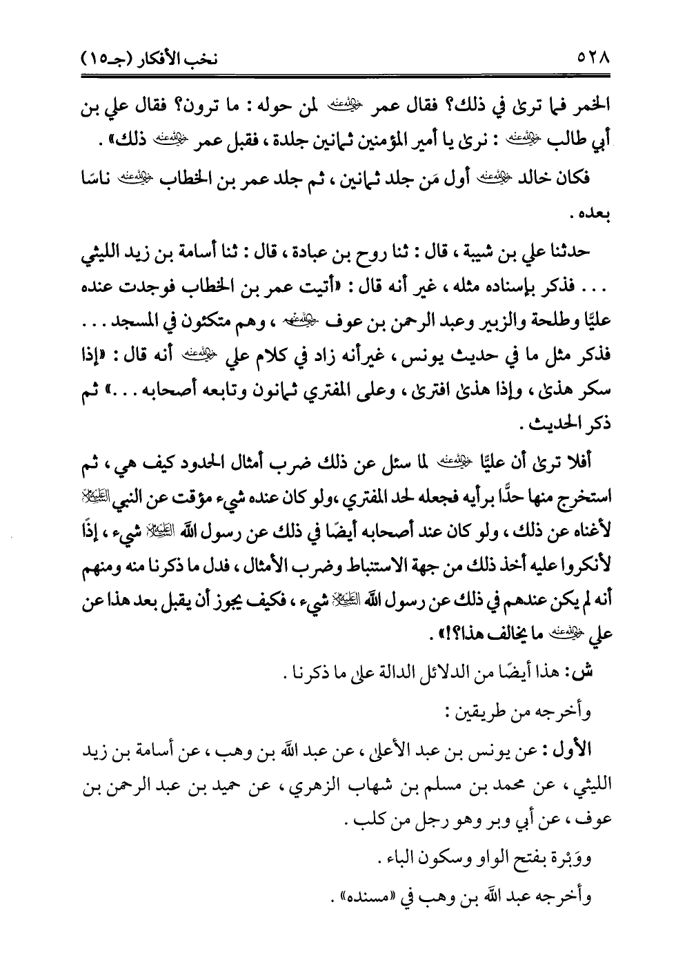 حدثنا علي بن شيبة، قال: ثنا روح بن عبادة، قال: ثنا أسامة بن زيد الليثي. . . . فذكر بإسناده مثله، غير أنه قال: "أتيت عمر بن الخطاب فوجدت عنده عليًّا وطلحة والزبير وعبد الرحمن بن عوف - رضي الله عنهم -، وهم متكئون في المسجد. . . . فذكر مثل ما في حديث يونس، غير أنه زاد في كلام علي - رضي الله عنه - أنه قال: "إذا سكر هذى، وإذا هذى افترى، وعلى المفتري ثمانون وتابعه أصحابه. . . ." ثم ذكر الحديث.