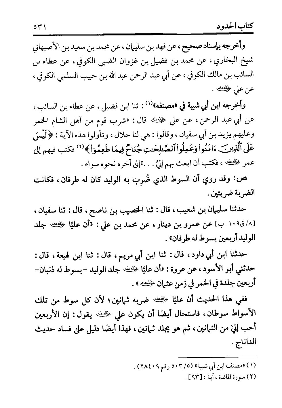 حدثنا سليمان بن شعيب، قال: ثنا الخصيب بن ناصح، قال: ثنا سفيان، عن عمرو بن دينار، عن محمد بن علي: "أن عليًّا - رضي الله عنه - جلد الوليد أربعين بسوط له طرفان".