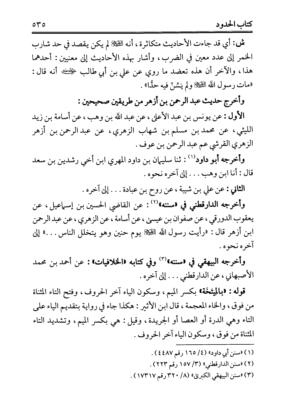 ش: أي قد جاءت الأحاديث متكاثرة، أنه -عليه السلام- لم يكن يقصد في حد شارب الخمر إلى عدد معين في الضرب، وأشار بهذه الأحاديث إلى معنيين: أحدهما هذا، والآخر أن هذه تعضد ما روي عن علي بن أبي طالب - رضي الله عنه - أنه قال: "مات رسول الله -عليه السلام- ولم يَسُنّ فيه حدًّا".